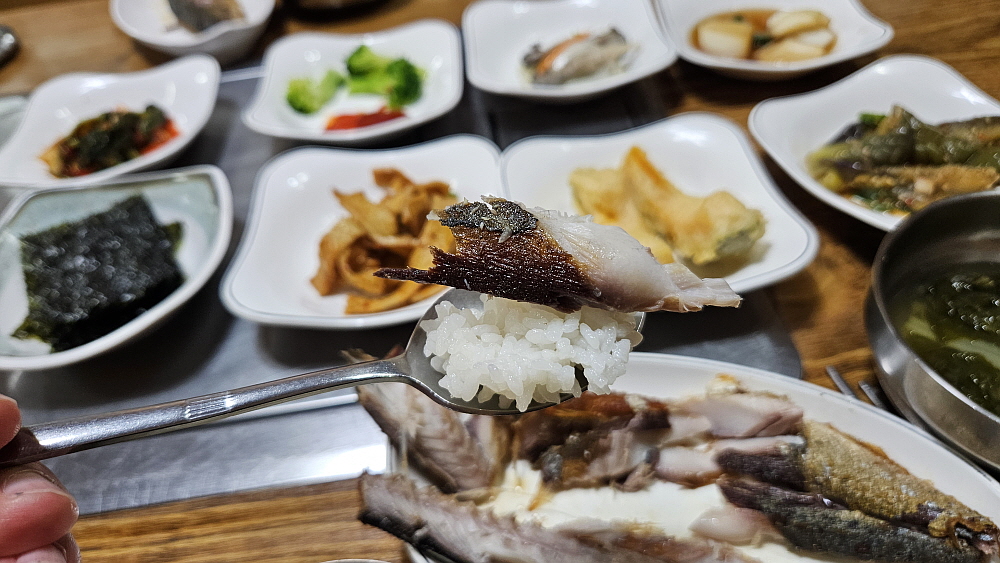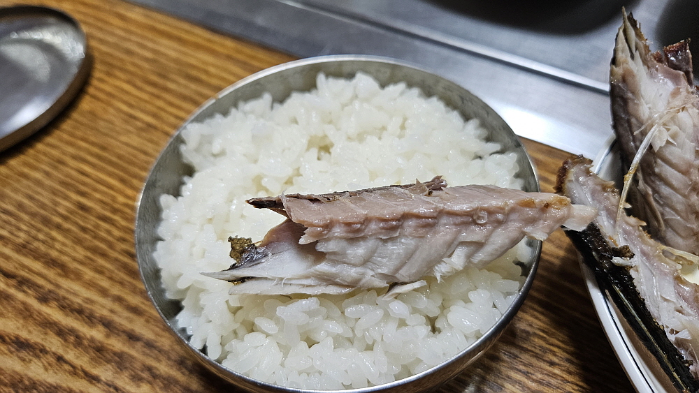 이날의 생선은 고등어자반이었다. 한 마리가 아니라 반 마리인 한 토막이다. 하지만 살이 많아 먹을만 했다. 고등어 반찬은 어릴적에도 정말 자주 먹었던 반찬이다. 국민 생선이라는 고등어자반은 호불호가 거의 없는 누구나 좋아하는 국민 반찬이다. 간간하게 짭짤한 자반고등어와 밥 한 그릇은 언제고 먹고 싶은 궁합니다. 영화 아수라에서 정우성이 이런 서민적인 밥집에서 고등어 반찬에 백반을 먹는 장면이 나온 것을 본적이 있다. 고등어 반찬은 그만큼 전국민이 어디서나 자주 먹는 익숙한 아이템이라는 소리일 것이다. 아욱국의 개성은 뚜렷하지 않지만 확실한 보조역할이 더해지니 고등어의 가치가 더욱 빛나는 것 같다.