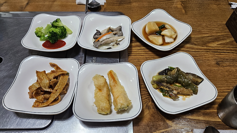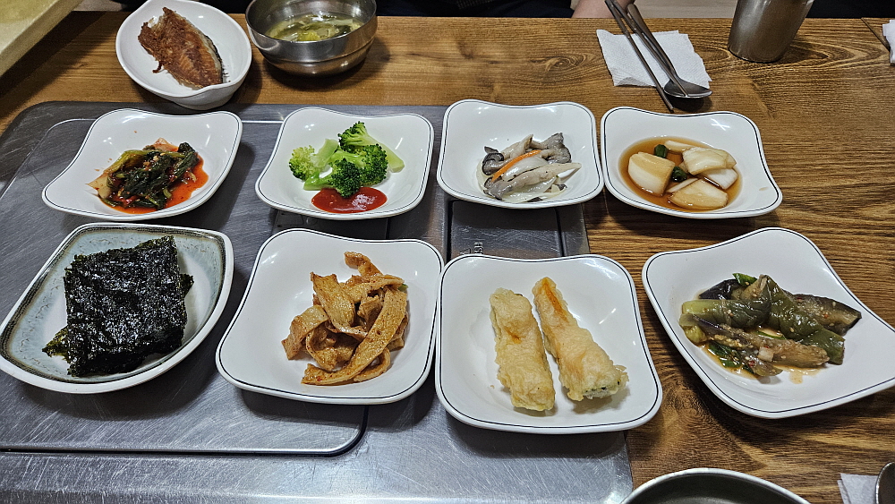 식당안은 세월의 무게를 느끼게 하는 오래된 인테리어였다. 업력이 꽤나 되는 집이라는 것을 대번 알 수 있다. 아주 오래 전 왔을 때는 좌식테이블이었다. 하지만 이젠 모두 이렇게 입식으로 바뀌었다. 하긴 요즘 좌식으로 앉는 집을 찾기는 어렵다. 생선백반을 예약을 하고 왔지만 워낙 점심시간에 손님들이 밀리는 곳이다 보니 우리가 도착했을 때 아직 반찬들이 나오지 않았다. 주인장이 알려주는 자리에 앉으니 그 때부터 반찬들이 나오기 시작했다. 기본적으로 8가지쯤 되는 밑반찬이 푸짐했다. 모두 직접 만든 것으로 보이는 가지와 호박, 오뎅, 버섯 등의 반찬이었다.