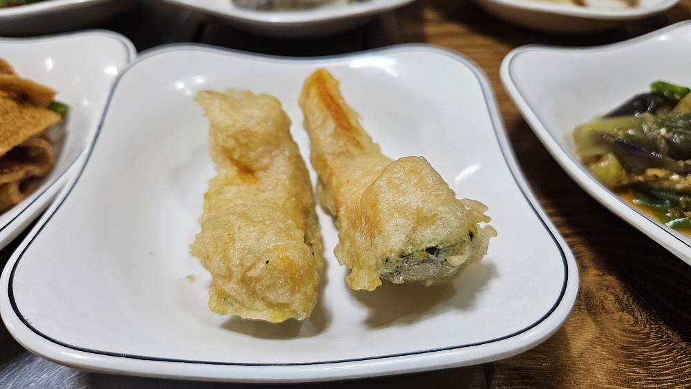 정갈해보이는 반찬들이 식욕을 불러 일으켰다. 특히 호박튀김은 다른 곳에선 흔히 보기 어려운 음식이었다. 갓 튀긴 것은 아니지만 그래도 포실포실한 것이 참 좋았다. 그냥 봐서는 어느 집에서나 늘 먹을 것 같은 구성의 반찬들이다. 거기에 아욱국이 나오고 생선 한 토막이 나온다. 원래는 같이 나온다는 계란 후라이도 한 개 있다. 뭔가 빈 것 같지만 빈틈없는 한 상이다. 따뜻한 쌀밥에 반찬을 두루 돌아가며 먹는 재미가 쏠쏠했다. 중간에 메인처럼 자리잡은 찌개가 하나 없다는 것이 좀 아쉽기는 했지만 여길 잘 아는 지인의 말로는 백반뿐 아니라 오징어볶음이나 제육볶음 또는 동태찌개도 맛이 괜찮다고 했다.