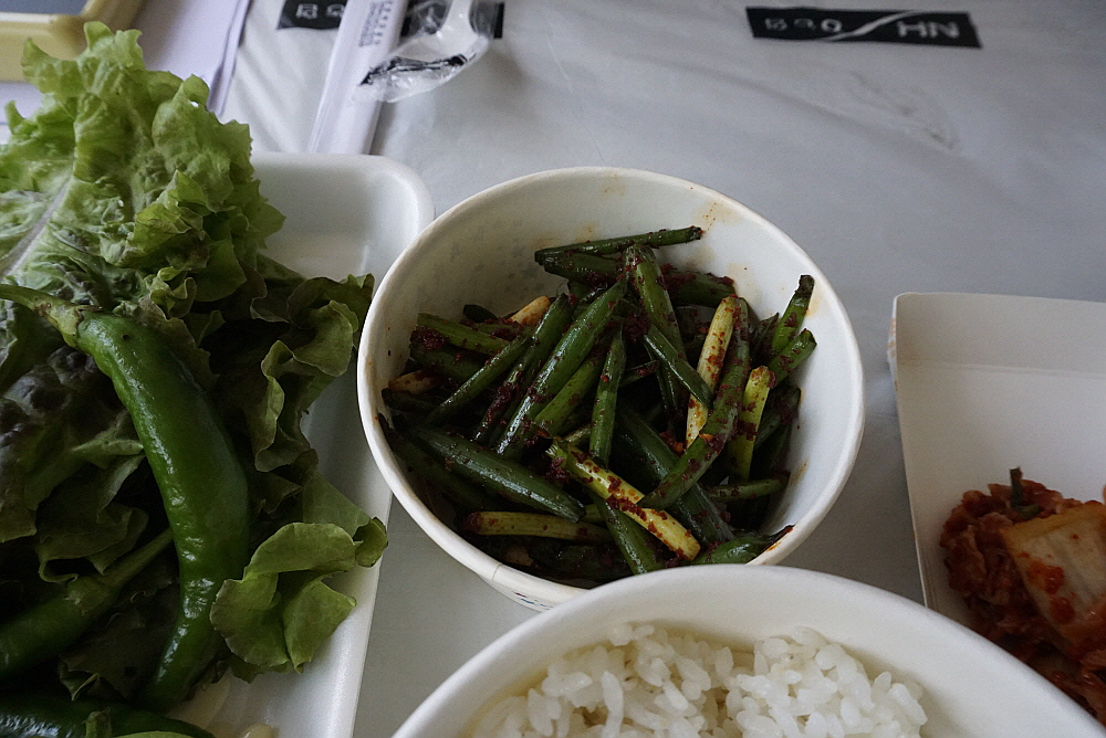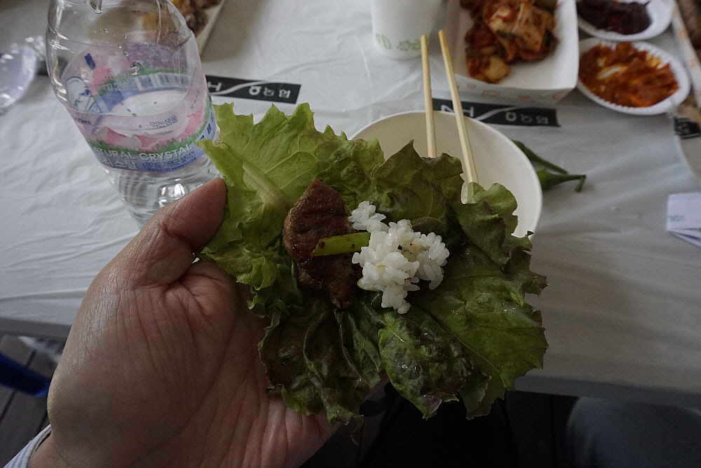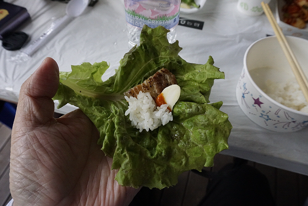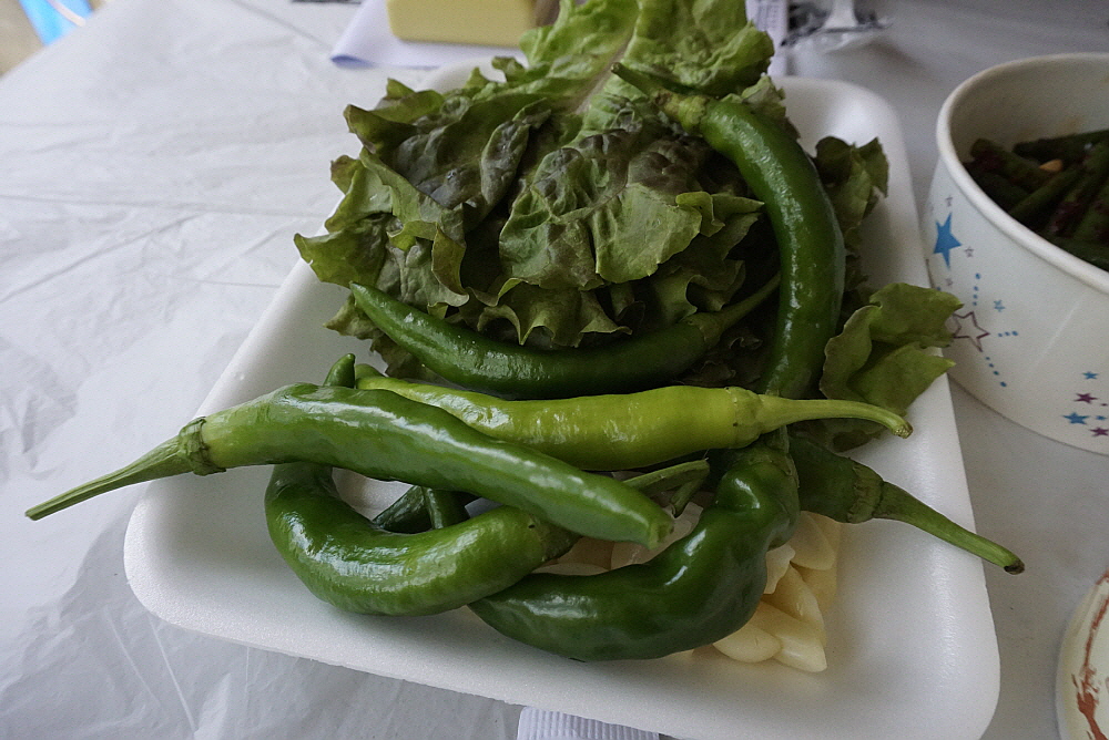 고추나 상추같은 야채들은 사 온것이 아니라 누군가의 후원으로 텃밭에서 가지고 온 것이라 했다. 그래서인지 더 부드럽고 맛이 좋았다. 요즘 채소 가격이 장난이 아니라 쌈밥집에서도 더 이상 무한리필을 하지 않는다고 하는데 여기서는 먹고 싶은 만큼 얼마든지 먹으라 했다. 실한 고추와 상추 그리고 마늘이 삼겹살과 만나면 바로 술 한 잔이 있어야 하는 조합인데 차가 있어 그러지 못한 것이 영 아쉬웠다. 손님들이 어느 정도 고기들을 먹었는지 이젠 직원들이 고기를 더 먹으라며 몇 접시를 들고 왔다. 고기를 많이 먹는 사람이라면 허리띠 풀고 시간을 넉넉하게 잡고 먹으면 되는 시간이다.