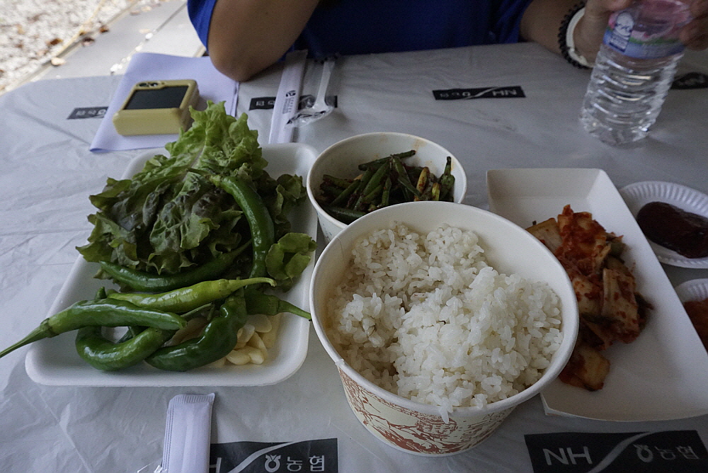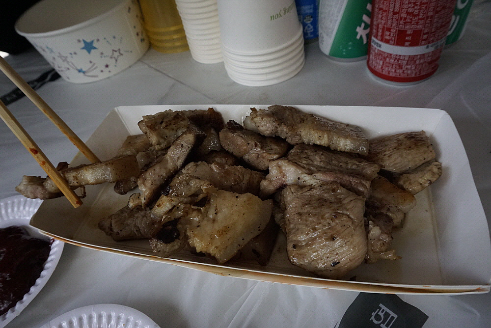 고기만 있는 것이 아니라 옆에는 과일과 야채도 듬뿍이다. 역시 있는 집의 잔칫날을 뭔가 다르다. 고기는 넉넉하게 준비했다니 조급할 필요는 없었다. 그렇게 조금은 앉아 기다리니 드디어 우리에게도 맛난 삼겹살을 먹을 기회가 왔다. 별 다른 반찬은 없었지만 숯불향이 밴 질좋은 고기와 밥이 있으니 더 이상 바랄 것이 없었다. 그리고 옆에 반가운 사람들이 함께 하니 그저 앉아 있는 것만으로도 즐거운 기분이 업되는 느낌이었다. 모처럼 덥지도 않고, 맑은 날씨로 이런 행사를 하기에 더없이 좋은 날이었다.