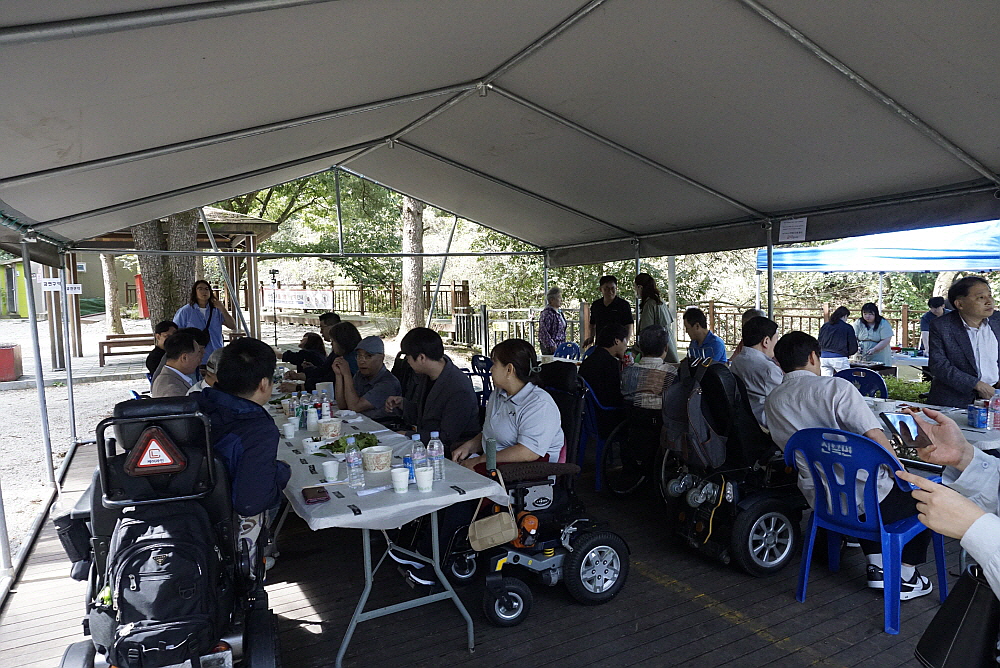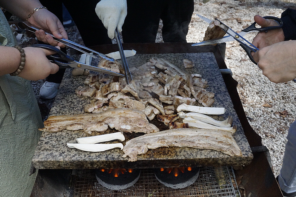 새로운 도약을 꿈꾸는 이들의 얼굴에서 뭔가 다부진 모습을 엿볼 수 있었다. 이렇게 좋은 날 먹거리가 빠질 수 없다. 이날은 포천장애인자립생활센터에서 점심을 도맡아 제공했는데 이 행사는 경기도의 공모사업에 채택이 되면서 예산 지원을 받았다고 했다. 이날 점심의 메뉴는 삼겹살이었다. 숯불에 직접 굽는 삼겹살은 이런 야외가 아니면 맛보기 힘든 먹거리이다. 숯불의 향이 그윽하게 밴 삼겹살과 밥 한 그릇이면 왕후장상이 부럽지 않은 것이 우리네 아니던가... 굽는 사람들은 많은 손님들의 입을 채우기 위해 분주하지만 기다리는 사람은 또 몇 분이 여삼추이다.