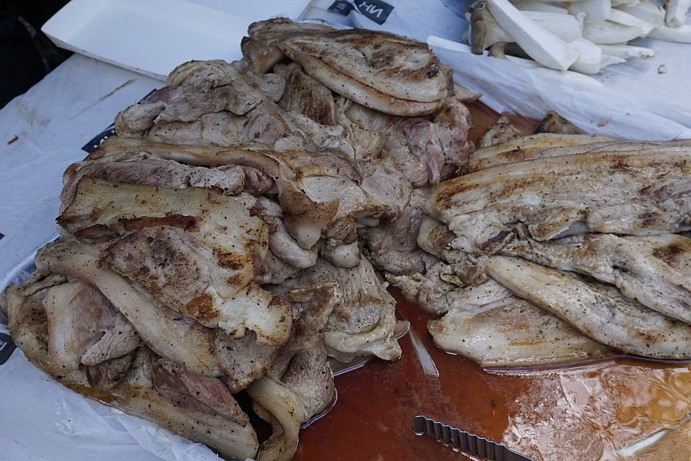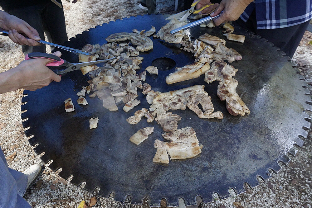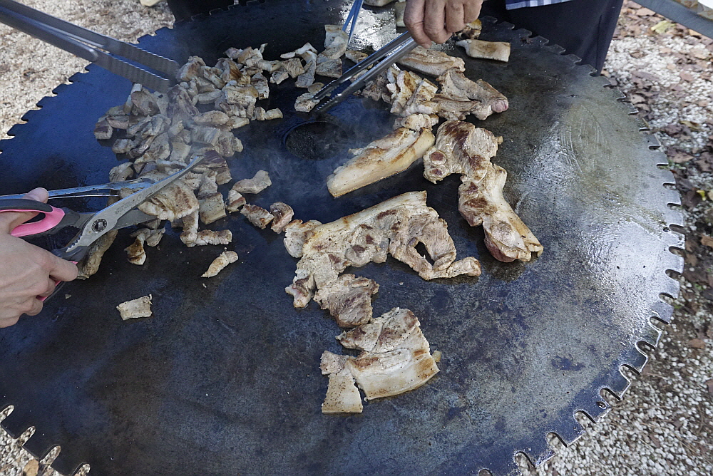 기다리다 못해 고기를 굽는 곳에 가보니 희한하게 생긴 불판이 있었다. 이 쇠판은 돌을 깍아 내는 톱날이란다. 이렇게 큰 톱날을 본적이 없는데 참 신기하게 생겼다. 하지만 톱날이 단단하고 두께가 상당해서 고기 굽는 용으로 자주 사용한다고 했다. 이것도 흔치 않은 일이다. 그 말을 들어서인지 정말로 고기가 더 맛나 보였다. 숯불에서 초벌을 한 고기를 다시 불판에서 익히는데 순식간에 굽는 것 같은데도 워낙 손님이 많다보니 우리까지 차례가 오는데 시간이 제법 걸렸다. 잔칫날 빨리 달라고 재촉할 수도 없고, 고기는 굽는 냄새는 계속 나고 이것도 참 곤욕이다.