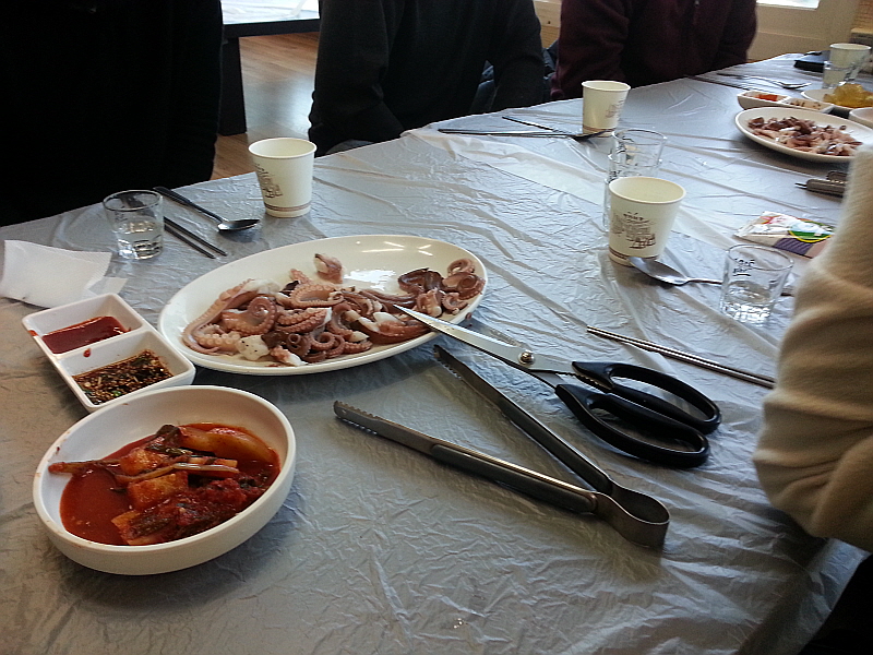쭈꾸미가 제철인지 쭈꾸미는 크기도 좋았고 맛도 부드러운 것이 괜찮았다. 아마도 쭈꾸미를 이렇게 숙회식으로 먹어 본 것은 이번이 처음이 아닌가 한다. 늘 매운 양념에 구이식으로 먹어만 봤지 이렇게 담백하고 재료 본연의 맛을 살리는 숙회는 먹어본 적이 없었다. 늘 그렇듯 숙회하면 오징어니까 오징어와 식감을 비교해 봤다. 오징어보다는 훨씬 부드럽고 야들야들하지만 씹는 맛은 덜한 말 그대로 작은 오징어였다.