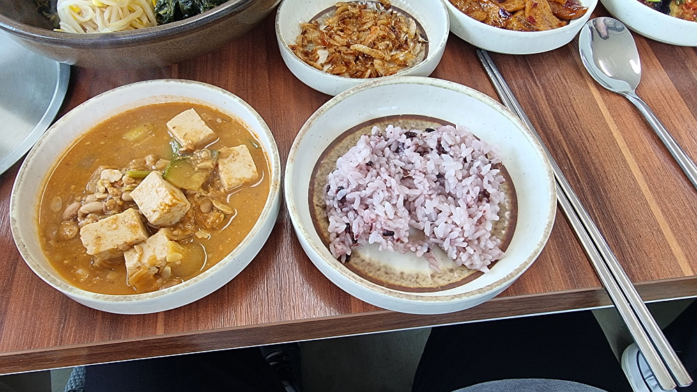 찌개는 된장찌개와 청국장을 고를 수 있는데 우린 사람이 많아 된장찌개도 먹고 청국장도 함께 먹을 수 있었다. 둘 중 뭐가 더 맛나냐고 한다면... 글쎄 개인적으로는 청국장이 더 낫더라는... 구수하고 진한 청국장은 먹으면서 몸이 가벼워지는 느낌이 드는 아주 좋은 음식이다. 제육고기도 넉넉하게 나오는데 보통 돼지 뒷다리 살같은 아주 저렴한 부위를 사용하지만 여기는 나름 고기 크기도 크고 먹을직스러웠다. 고기 좋아하는 사람들에겐 이 고기반찬 하나로 밥 한 공기는 그냥 뚝딱할 수 있을 정도의 퀄리티라 하겠다.