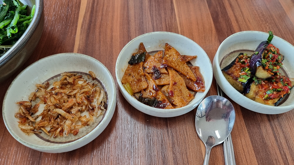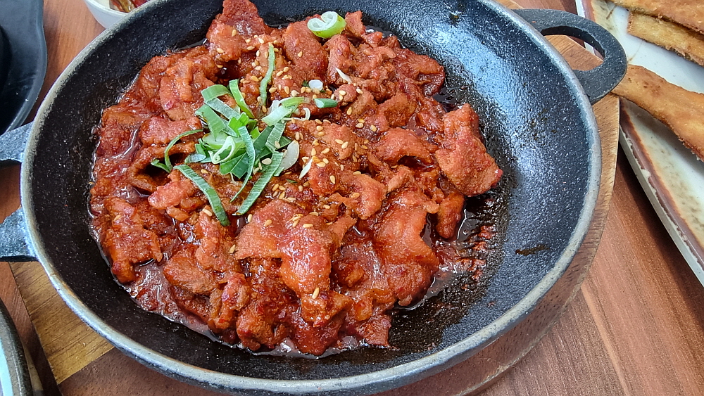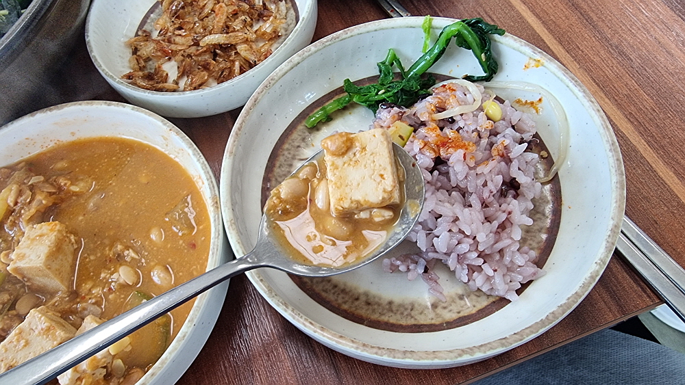 찌개는 된장찌개와 청국장을 고를 수 있는데 우린 사람이 많아 된장찌개도 먹고 청국장도 함께 먹을 수 있었다. 둘 중 뭐가 더 맛나냐고 한다면... 글쎄 개인적으로는 청국장이 더 낫더라는... 구수하고 진한 청국장은 먹으면서 몸이 가벼워지는 느낌이 드는 아주 좋은 음식이다. 제육고기도 넉넉하게 나오는데 보통 돼지 뒷다리 살같은 아주 저렴한 부위를 사용하지만 여기는 나름 고기 크기도 크고 먹을직스러웠다. 고기 좋아하는 사람들에겐 이 고기반찬 하나로 밥 한 공기는 그냥 뚝딱할 수 있을 정도의 퀄리티라 하겠다.