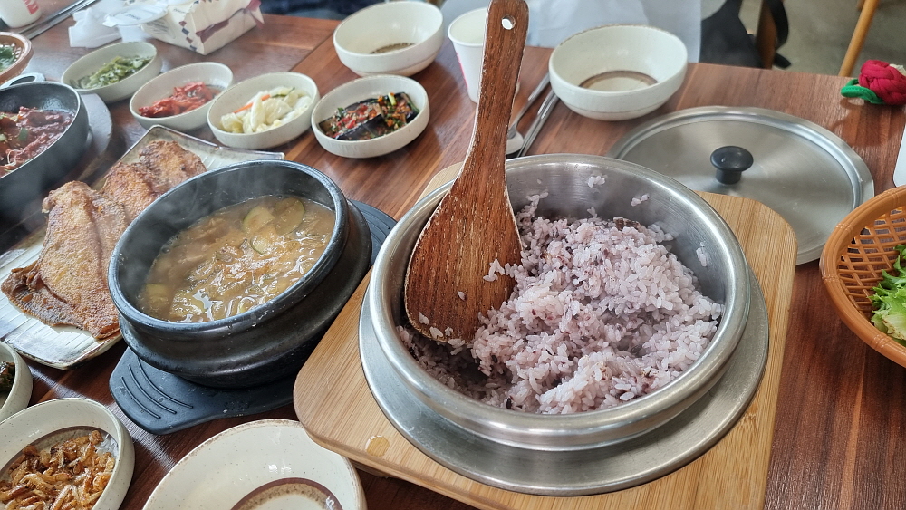 밥도 그냥 공기밥은 아니고 솥밥에 여러 명이 덜어 먹을 수 있게 나온다. 나중에 솥에선 구수한 누룽지도 만들어지는 방식이다. 과연 제대로 된 한 상이라 하겠다. 너나 할 것 없이 다들 만족해 하는 표정들이었다. 과연 맛집이란 이름이 유명무실하지 않은 곳이다. 점심 시간에는 빈자리 찾기도 쉽지 않다는 곳이다. 이렇게 가성비가 좋으니 교통이 편리한 곳은 아니지만 주차장에 차를 세우기가 힘들 정도다. 밑반찬들이 자극적이지 않아서 리필을 하지 않을 수 없었다. 밥과 반찬을 먹으면서 잘 조절해야지 안 그러면 나중에 비빔밥을 먹을 수 없을지도 모른다.