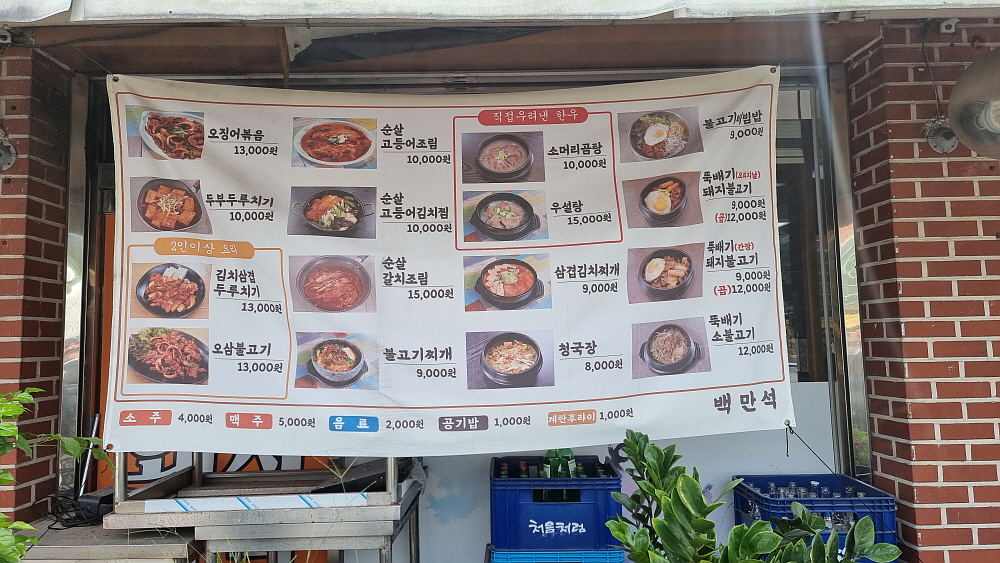 43번 국도변에 있는 밥집으로 인근에서 맛 좋다는 소문이 자자한 집이라 하여 찾아갔다. 규모는 단촐하고 아주 큰 식당은 아니며, 주방과 홀을 부부로 보이는 주인장 두 사람이 열심히 일하고 있었다. 점심 시간에 임박해서 갔기 때문에 식당 안에는 손님들이 제법 많았다. 보기에 인근의 사업장에서 오는 사람들 같았다. 이런 밥집이 직장 근처에 있다면 구내식당처럼 대놓고 먹기는 할 것 같다. 메뉴는 상당히 다양했다. 일반적인 백반집보다 선택의 폭이 넓었다. 우리는 두명인지라 따로 주문하지 않고 고등어김치찜을 시켰다. 이런 것도 일종의 상생의 길이라 생각했다.