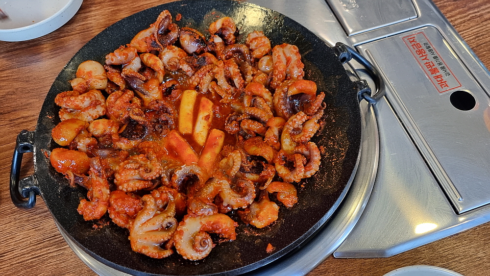 주인장의 말로는 중간맛도 왠만큼 매운 맛이란다. 보통 사람들은 땀 깨나 흘리면서 먹는단다. 과연 우린 그 맛에 도전하여 이겨낼 수 있을까? 기대 반, 우려 반으로 그렇게 쭈꾸미가 나오길 기다렸다. 평소 우리가 자주 갔던 잘빠진 쭈꾸미 집의 비주얼과는 사뭇 다른 모양의 쭈꾸미가 나왔다. 잘빠진 쭈꾸미를 포함하여 대부분의 쭈꾸미 집엔 쭈꾸미 외에 야채가 엄청 들어가는데 여긴 야채는 아예 없고 오로지 쭈꾸미만 시뻘건 양념에 듬뿍 빠져 나왔다. 보기만 해도 이마에 땀이 맺힐 것 같은 엄청난 비주얼이었다.