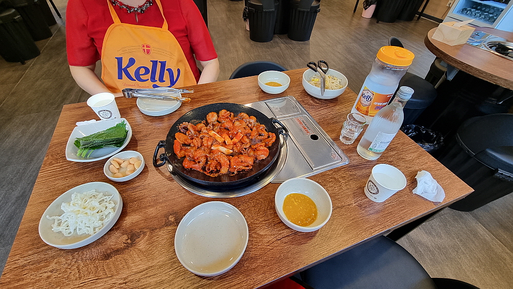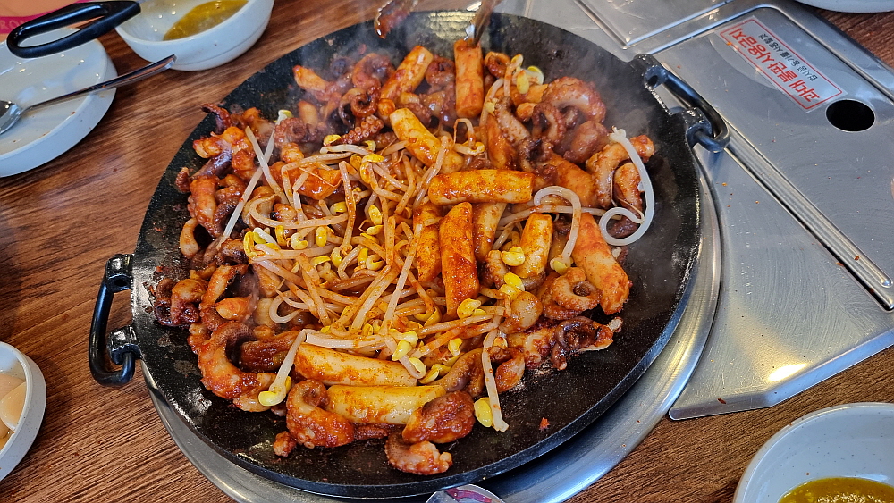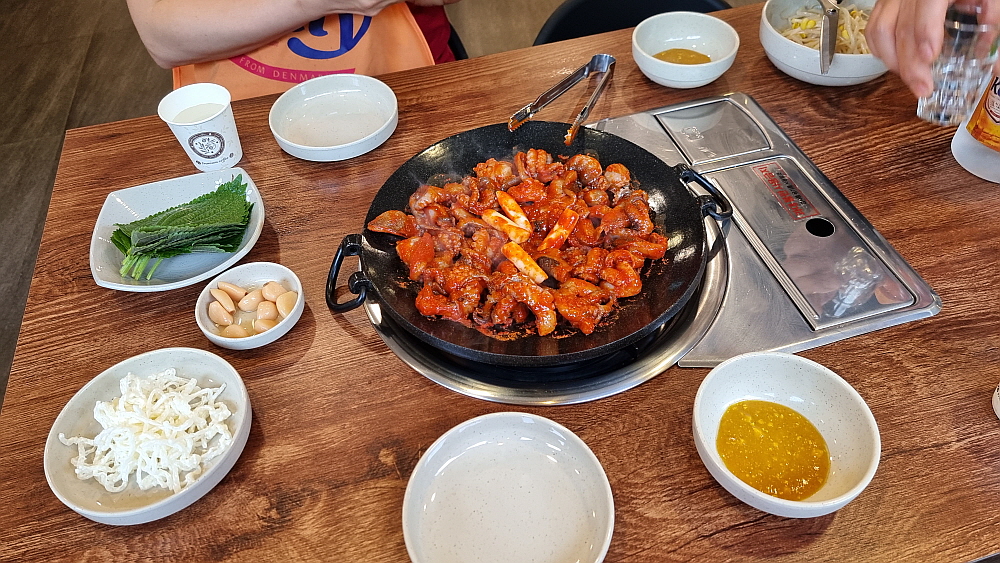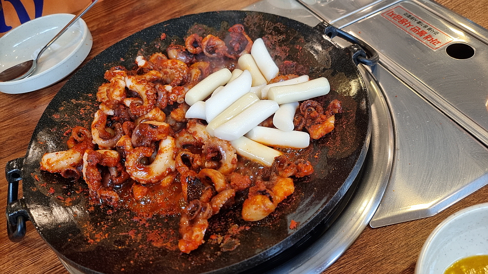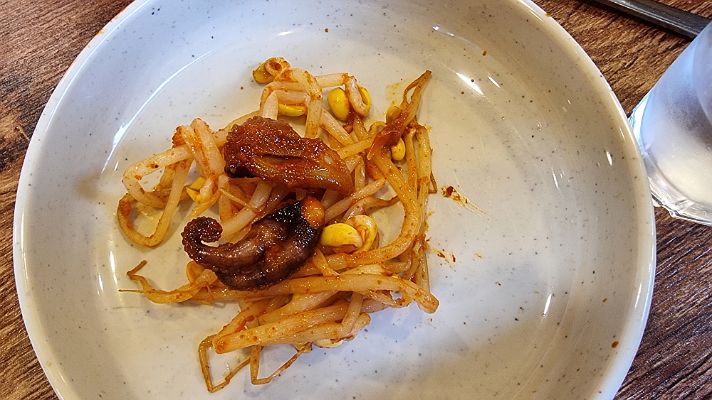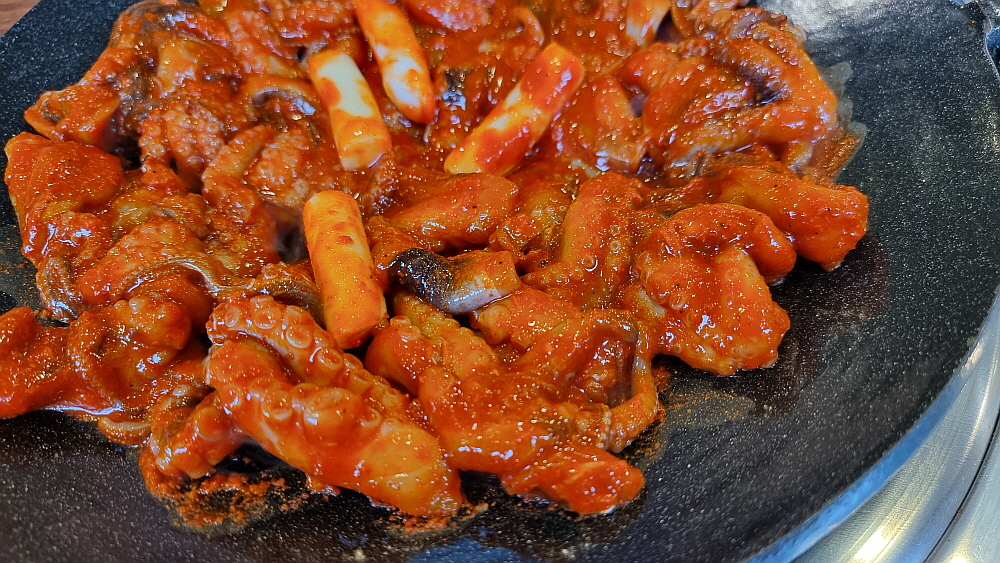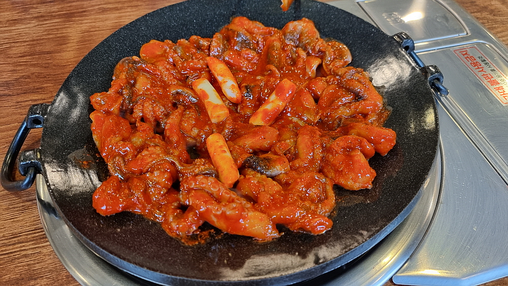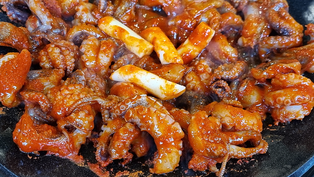 주인장의 말로는 중간맛도 왠만큼 매운 맛이란다. 보통 사람들은 땀 깨나 흘리면서 먹는단다. 과연 우린 그 맛에 도전하여 이겨낼 수 있을까? 기대 반, 우려 반으로 그렇게 쭈꾸미가 나오길 기다렸다. 평소 우리가 자주 갔던 잘빠진 쭈꾸미 집의 비주얼과는 사뭇 다른 모양의 쭈꾸미가 나왔다. 잘빠진 쭈꾸미를 포함하여 대부분의 쭈꾸미 집엔 쭈꾸미 외에 야채가 엄청 들어가는데 여긴 야채는 아예 없고 오로지 쭈꾸미만 시뻘건 양념에 듬뿍 빠져 나왔다. 보기만 해도 이마에 땀이 맺힐 것 같은 엄청난 비주얼이었다.