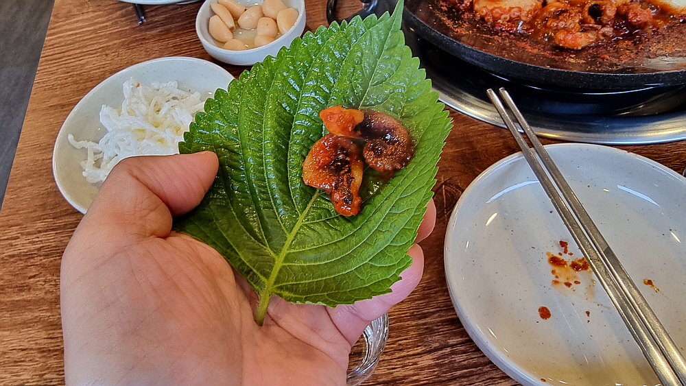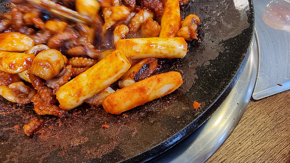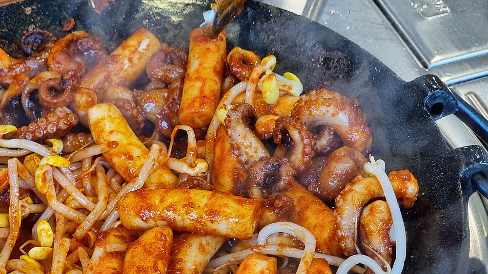 중간 맛이라고는 하지만 너무 매울 것 같아서 떡사리를 주문했다. 그리고 나중에 넣으라는 콩나물도 투입했다. 이렇게 하고 나니 매운맛이 좀 진정되는 것 같았다. 별 다른 야채없이 쭈꾸미만을 볶으니 온통 쭈꾸미에 집중할 수 있어 좋았다. 왜 그런지 몰라도 쭈꾸미는 상추보다는 깻잎에 싸 먹는 것이 더 궁합이 잘 맞는 것 같다. 이집의 장점중에 하나는 카레 소스를 준다는 것이다. 다소 이질적으로 보이는 카레소스와 매운 쭈꾸미가 의외로 잘 어울린다는 사실을 이번에 알게 되었다. 매운 양념을 잘 입은 떡사리는 떡볶이로 변신하여 젖가락을 기다리고 있었다.