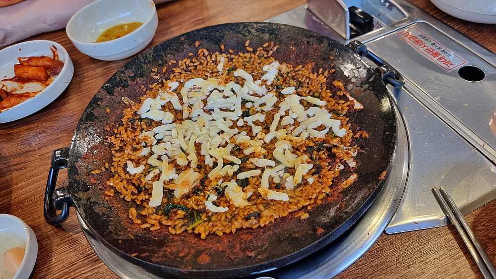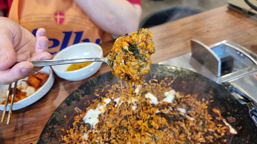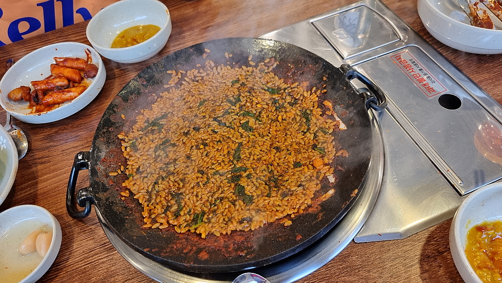 떡과 쭈꾸미와 콩나물의 박자가 아주 잘 맞을 때 쯤이면 드디어 쭈꾸미들은 뱃속으로 모두 사라지게 된다. 하지만 참 아쉽다. 낙지도 쭈꾸미도 많이 집어 먹은 것 같은데 먹고 나면 뭔가 덜 먹은 것 같은 아쉬움이 남는다. 아마도 이런류의 음식들이 모두 그런가 보다. 그래서 하는 수없이 볶음밥이라는 마지막 카드를 꺼내 들었다. 그렇지 우리에겐 아직도 볶음밥이 남아 있었지... 매콤한 양념과 쭈꾸미가 혼합되어 볶아진 마지막 볶음 양념은 포기하기 힘든 유혹이자 마지막 보루같은 것이다. 한국 사람들은 감자탕이든, 삼겹살이든, 곱창이든 넓은 팬에서 구워 먹는 음식들은 모두 볶아 버린다.