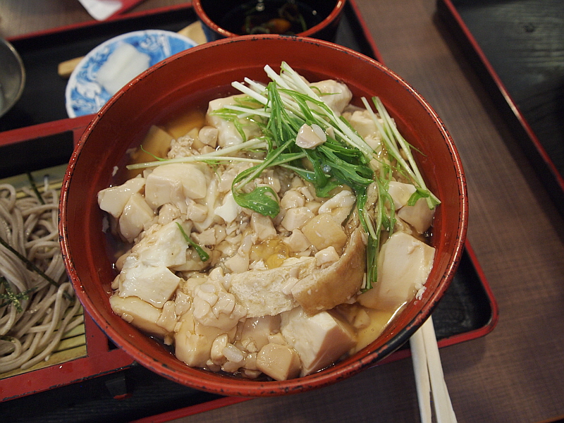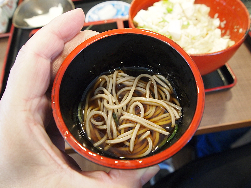 결론적으로 말하자면 내가 주문한 두부 덮밥이 제일 시원치 않았다. 아들의 오야꼬동이나 마눌의 튀김 소바 세트는 나름 괜찮은 맛이었다. 그래서 새롭고 처음 먹는 음식을 주문할 때는 약간의 모험이 따르게 마련이다. 내가 언제 오늘이 아니라면 이렇게 생긴 두부덮밥을 먹어보겠는가? 맛이 아주 없는 것은 아니지만 그냥 순두부에 간장 양념을 넣고 밥에 비빈 것이라 글쎄 특별한 맛이 난다고 하기 어려운 덮밥이었다. 소바는 그런대로 괜찮아서 쯔유에 찍어 먹는 맛이 나름 좋았다. 작은 그릇에 담겨 있는 쯔유가 어찌나 짜던지 마눌은 물을 넣어 희석을 하고서 먹었다. 참 이상하지 사람 입맛이 다 비슷할 텐데 왜 이리 짜게 먹을까? 다행인 것은 아들의 덮밥이나 내 덮밥은 그렇게까지 짜진 않았다는 것이다. 부드러운 식감의 두부덮밥은 좀 나이 많은 사람들이 좋아할 그런 식감이었다.