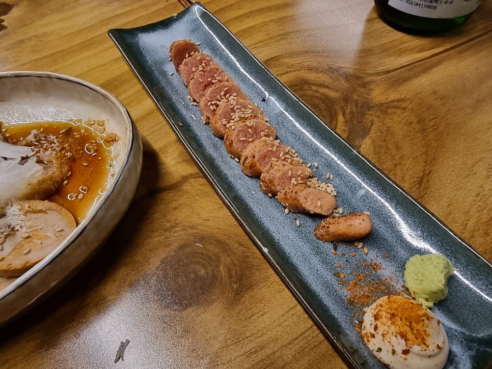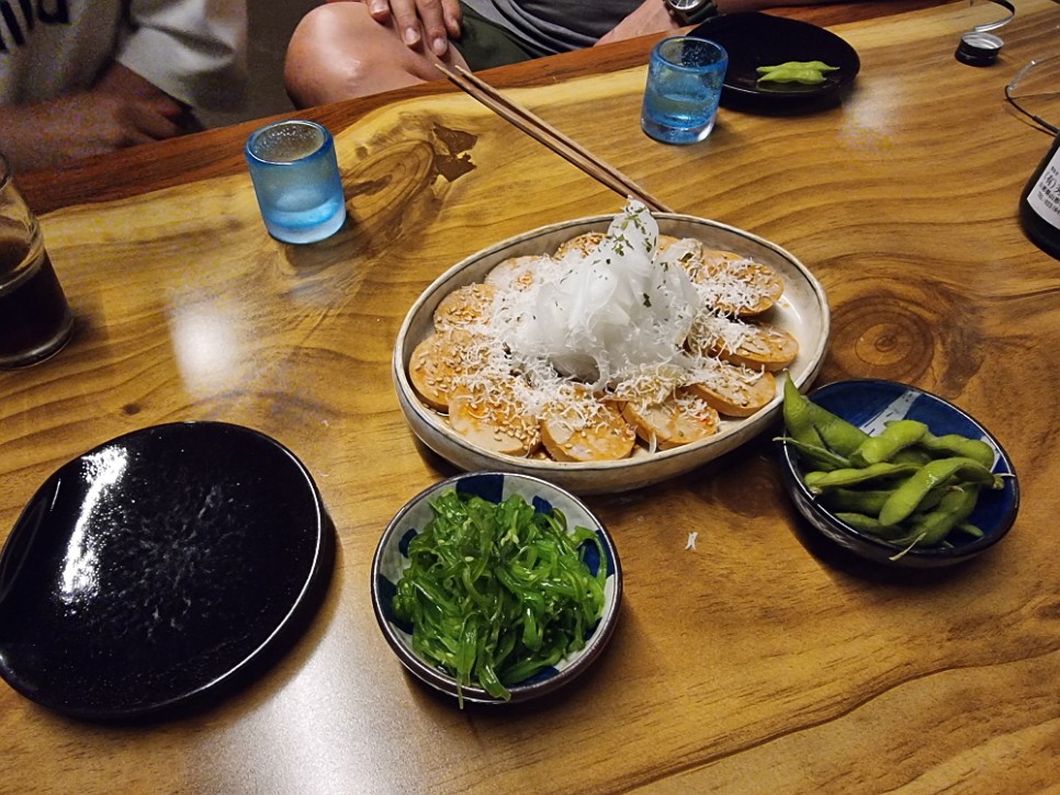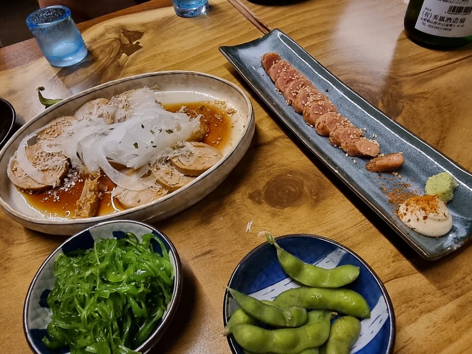 실제 사케와 너무나 잘 어울리는 안주였다. 저녁을 먹고 온 사람들도 얼마든지 즐길 수 있을 정도로 가벼우면서 깊은 맛이 나는 제대로 된 일식 안주였다. 다음 안주는 명란이었다. 일본식 명란젓은 덜 짜고 우리네 반찬과는 조금 다른 식감을 보이는데 이집의 명란젓은 우리식에 더 가깝다고 해야 할 것 같다. 짭짤하다 보니 안주로는 더 없이 훌륭한 아이템이었다. 타다끼처럼 겉을 살짝 그을린 것도 신의 한 수 였다. 탄 맛과 향이 나면서 안은 촉촉하니 짭짤한 맛이 아주 좋았다. 이런 좋은 안주들 덕분에 사케를 폭주하 듯 마셨고 그 결과는 블랙아웃이었다.