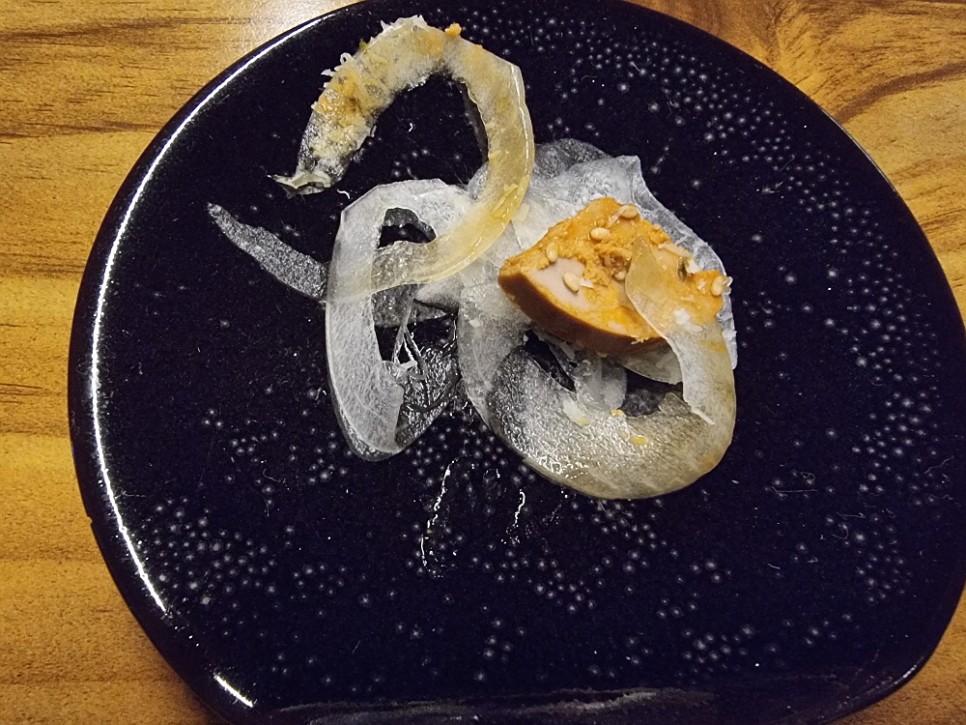 기본 안주도 일본식이었고, 안주 대부분이 정통 일본식이라 했다. 그래서 주문한 첫 번째 안주는 아귀간이었다. 보통 아귀간은 아귀찜이나 탕으로 먹을 때 안에 넣어 끓여 먹는 것이 우리네 방식이지만 일본에서는 명란젓처럼 젓갈을 만들어 먹는단다. 그런데 아귀간을 다루는 것이 쉽지 않아 냄새도 나고 씁쓸한 맛이 나서 버리는 경우가 많다는 것이다. 하지만 이집의 아귀간은 아주 훌륭했다. 말수 적은 주인장은 일본식 요리를 제대로 수련하고 온 실력자 임에 틀림없었다. 이런 맛은 서울 강남에서도 맛보기 힘들다는 칭찬이 난무했다.