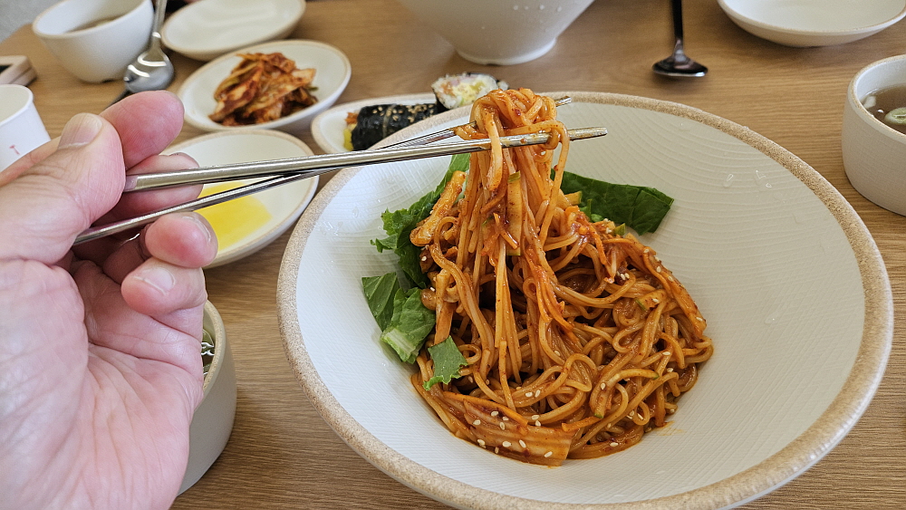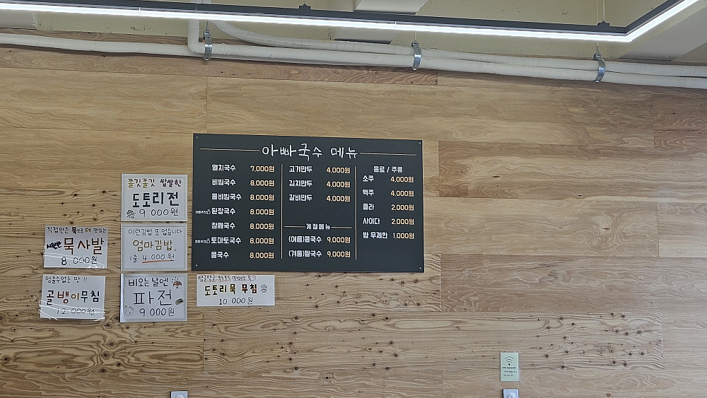 가게 안은 밖에서 볼 때보다 더 커보였다. 이집이 영업을 하기 전에도 식당자리였던 것 같은데 이전엔 무엇이 있었는지 기억이 나지 않았다. 신읍동 시내는 사실 상권이 많이 축소되었다. 지방 경제의 암울한 현실이 느껴지는 단면이 있다. 그렇지만 계속 식당이나 술집은 생기고 없어지고 한다. 사실 자영업은 선택이라기 보다 현재 우리나라에서는 필수일 수도 있다. 아무튼 여기 새롭게 국수집이 들어섰다는 것은 아주 즐겁고 기분좋은 일이다. 우리는 비빔국수와 만두 그리고 김밥도 주문했다. 처음 온 집이니 이것 저것 먹어봐야 제대로 된 맛을 알 수 있을 것 같았다.