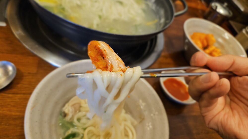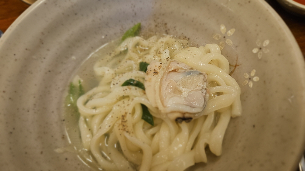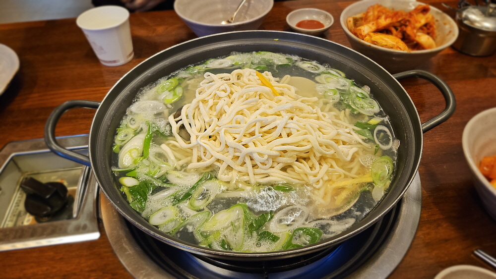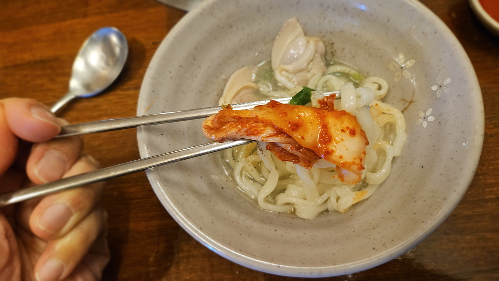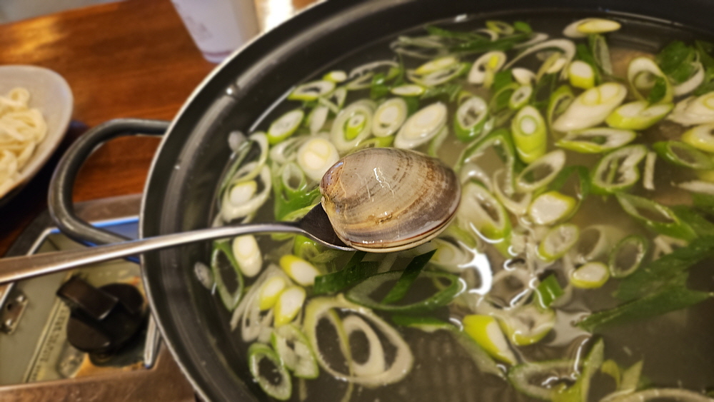 조금 이른 시간에 들어간 탓인지 실내에는 우리밖에 손님이 없었다. 나중에 알게 된 사실이지만 이 근처가 온통 맛집이 엄청 많았다. 소비자 입장에서 선택지가 넓은 곳이란 뜻이다. 우리는 백합칼국수 2인분을 주문했다. 담백하게 다른 어떤 메뉴도 보지 않고 그냥 시그니쳐 메뉴에 집중했다. 이곳의 먹는 방법은 육수와 칼국수 면을 따로 내어주는 것이다. 일정 시간 지나 육수가 끓어 오르고 백합조개가 익을 때쯤 면을 넣어 다시 익히는 것이다. 다 익은 백합조개는 면과 상관없이 건저내어 미리 먹어도 된다. 조개도 소고기처럼 너무 오래 익히면 살이 질겨지기 때문에 적당한 시간을 익히는 것이 중요하다.
