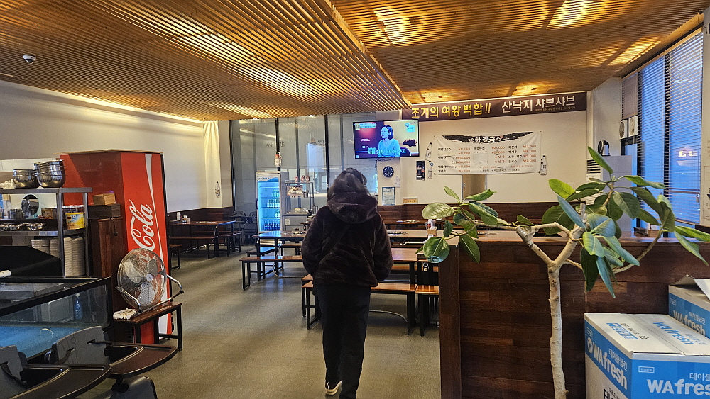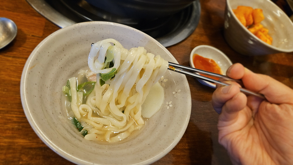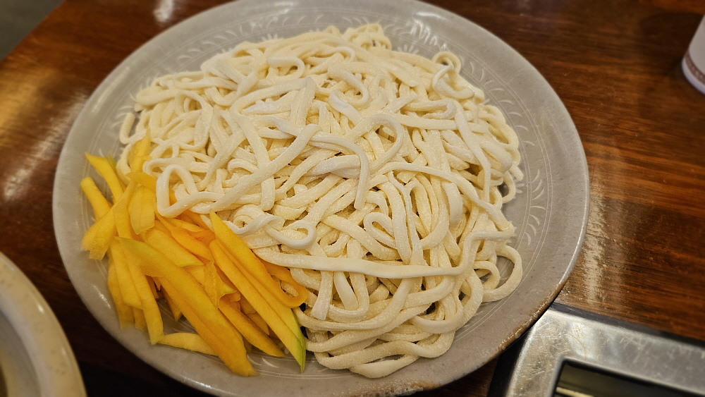 하지만 면이 다 익으면 만족은 배가가 된다. 야들하면서 쫄깃한 면발은 조개 국물과 정말 잘 어울렸다. 이런 맛집에 왜 손님이 별로 없는지 의아한 순간이었다. 아마도 아직 시간이 일러서 그런 것일 것이다. 이 추운 계절에도 이렇게 뜨끈한 국물에 칼국수를 먹고 있노라면 이마에 땀이 송글 송글 맺히는 것이 느껴진다. 어느 정도 시간이 지나면 땀이 엄청 흐르기 시작한다. 하지만 이런 불편에도 불구하고 이렇게 뜨끈한 국물을 먹는 것이 추운 겨울과 맞설 수 있는 힘을 주는 것은 맞는 것 같다. 우리가 먹는 동안 다른 손님들이 들어오기 시작했다. 그렇지... 이런 맛집엔 손님들이 붐벼야 제맛이지~
