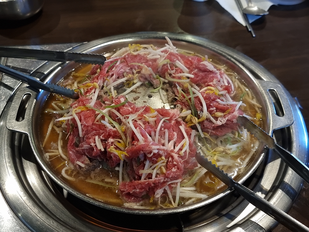 가격도 착한 편이다. 불고기와 돌솥밥이 나오는 정식세트가 15,000원이다. 물론 한우 불고기는 아니지만 그래도 이 정도 가격이라면 가성비가 좋은 편이다. 그냥 백반집에서 먹어도 이 정도 가격은 나올 것이다. 이집 불고기의 특이한 점은 고기와 함께 숙주가 엄청 많이 들어간다는 점이다. 보통은 파나 버섯같은 야채를 넣는 곳이 많은데 여긴 숙주이다. 그리고 다른 집들은 거의 들어가는 당면이 없다. 그냥 고기와 숙주 그리고 약간의 파가 들어가는 것이 전부이다. 이런 조합은 매우 색다른 것이다. 이런 비주얼의 불고기가 있다니...