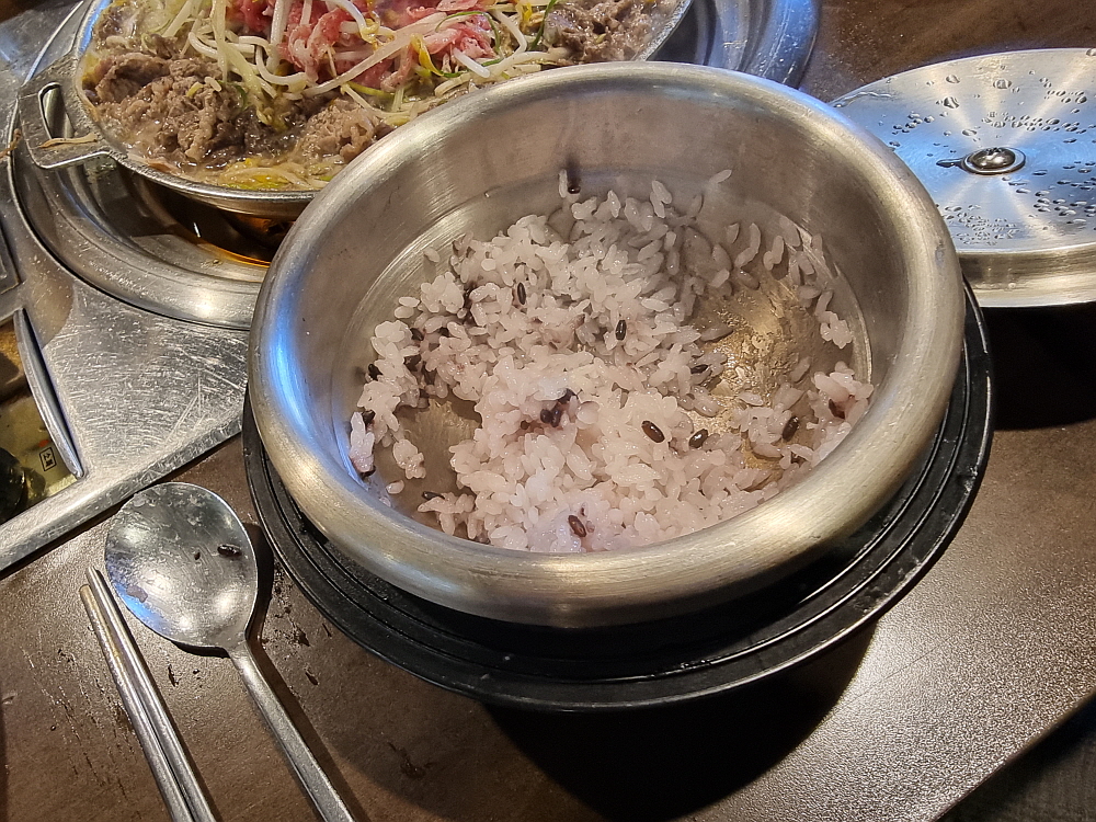 또 한가지 고마운 것은 밥이 돌솥밥이라는 것이다. 그냥 공기밥만 나와도 이 상황에서는 불만이 없겠지만 이렇게 뜨끈한 밥이 나오니 달달한 불고기와 정말 잘 어울렸다. 밥을 덜어 낸 후 물을 부어 먹는 숭늉도 일품이었다. 솥밥은 만들기도 번거롭지만 아무래도 품이 더 들어간다. 그래서 그냥 공기밥과 돌솥밥을 고르게 한 뒤 가격을 달리하는 집들이 많다. 하지만 여긴 그냥 기본 구성이 솥밥이다. 그런 점도 맘에 들었다. 이런 가성비와 만족도 때문인지 점심시간이 다가 오면서 가게 안은 북새통을 이뤘다. 역시 좋은 식당은 위치가 중요하지 않다.