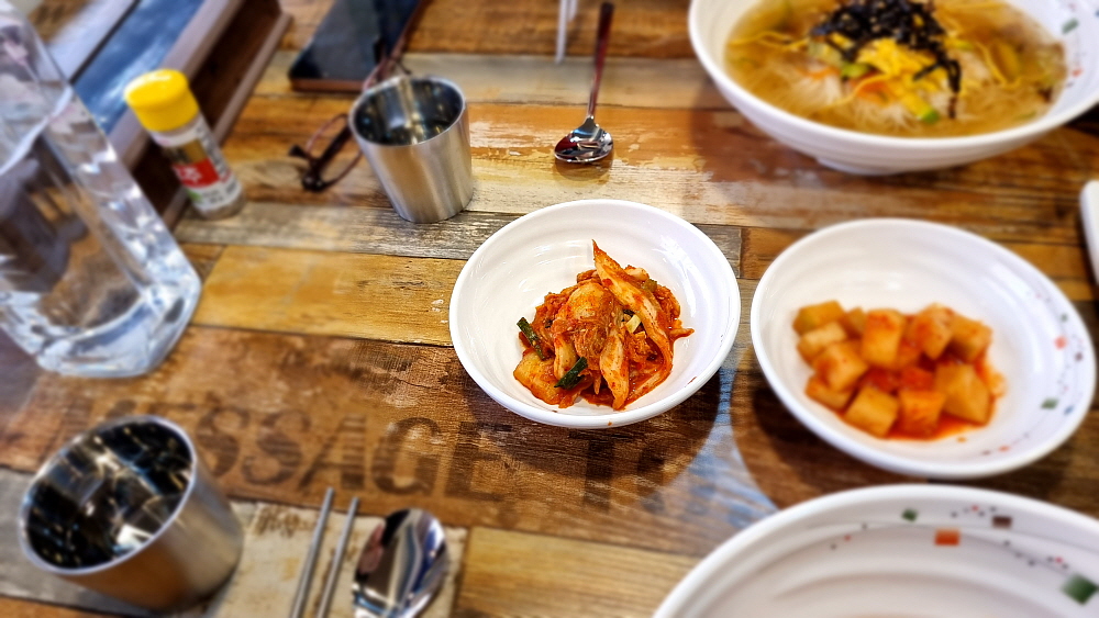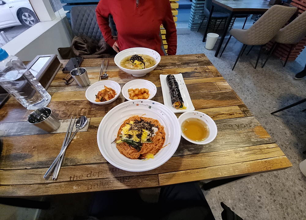 아담하고 예쁜 실내 인테리어가 차 한 잔 해야하는 분위기였지만 어쨌든 우리는 잔치국수와 비빔국수 그리고 김밥을 주문했다. 가격이 아주 착한 편인데 잔치국수는 6,000원 밖에 안 한다. 가성비에서는 일단 합격이다. 과연 맛은 어떨지... 음식이 나오는 구성을 보니 주인장의 성격을 알 수 있을 것 같다. 아마도 깔끔한 성격일 것이다. 국수와 김밥 구성은 언제나 성공적이지만 분위기까지 좋으니 더 할 나위 없이 좋은 식사라 하겠다. 첫 맛은 역시나 깔끔, 담백이었다. 비빔국수가 좀 새콤함이 강하다는 것 말고는 전체적으로 간이 세지 않고, 자연스러운 맛이라 하겠다.