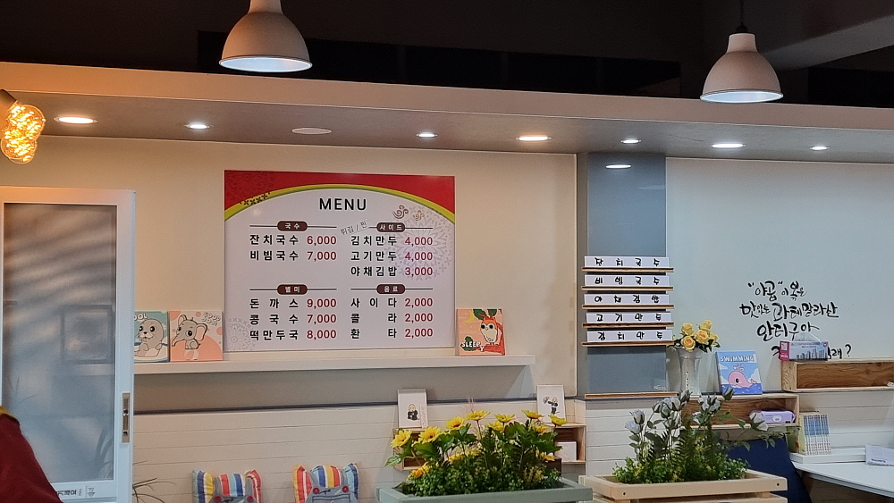 우연히 가산면 사무소 앞에 갔다가 이집을 발견했다. 겉에서 보면 딱 카페 같아 보이는 식당이다. 들어가 보면 더욱 그렇다. 아마도 카페를 하다가 업종을 변경한 것 같다. 식당 이름에서도 알 수 있듯 이집은 잔치국수가 주력인 집이다. 명성잔치국수라는 상호에 더 맘이 끌렸다. 잔치국수는 말 그대로 잔치집에서 먹는 국수 아니겠는가? 기쁘고 행복하고 즐거운 잔치자리에 모두 둘러 앉아 맛나게 후루룩 먹는 잔치국수 말이다. 그런 흥겨운 자리를 한 그릇의 국수를 먹으면서 음미할 수 있다면 그것도 즐거운 일이다.