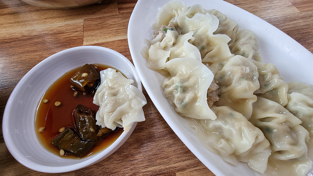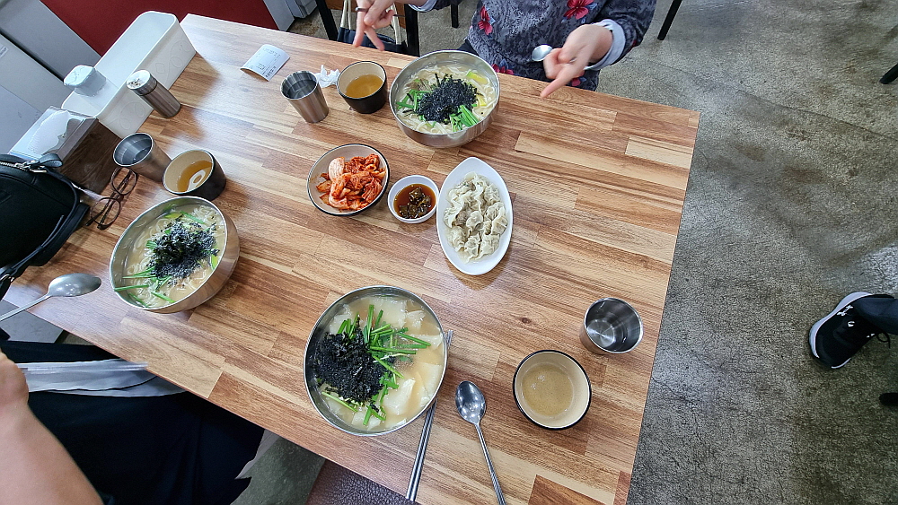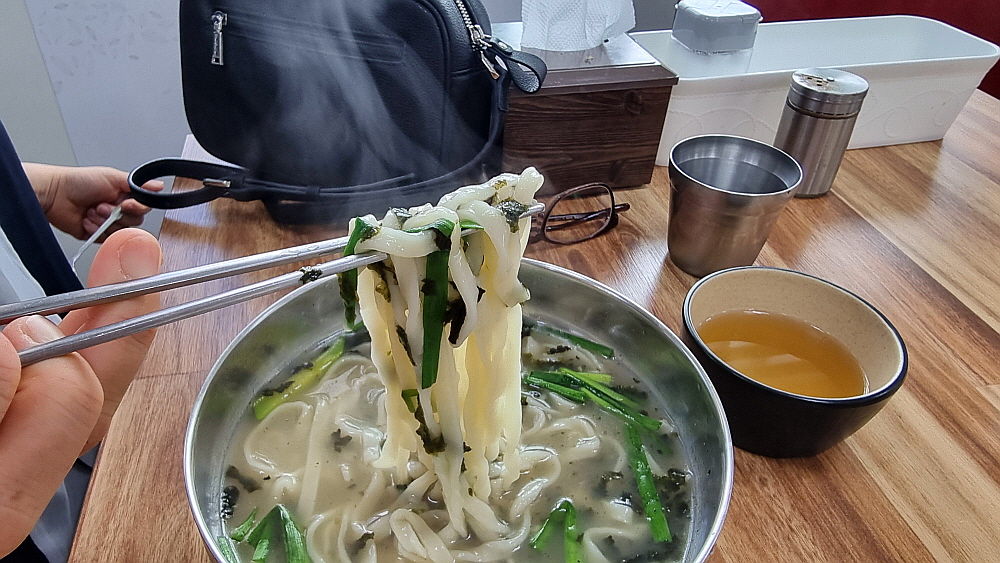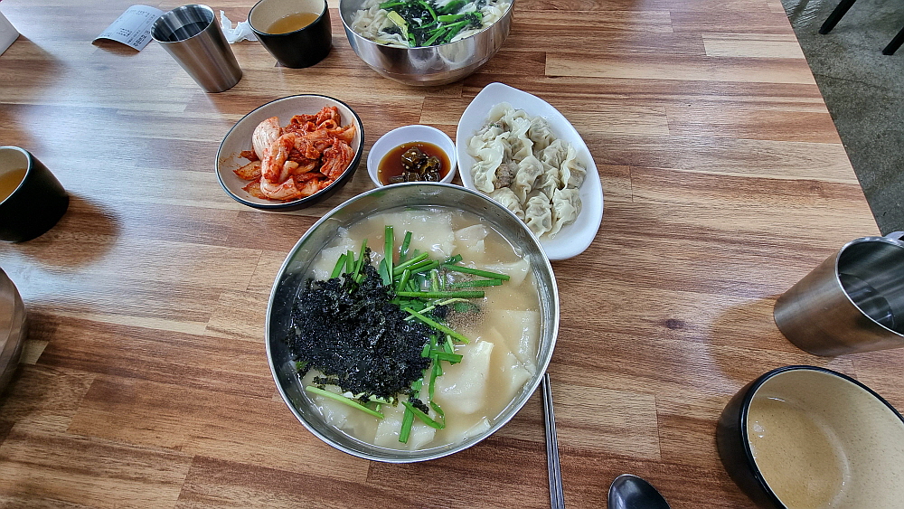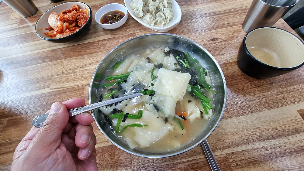 주문도 키오스크에서 해야 한다. 우린 이집의 시그니쳐 메뉴인 칼국수와 수제비, 그리고 물만두를 주문했다. 수제비는 6,500원이다. 나중에 보니 여긴 감자랑 호박이 더 들어갔다. 아마도 그 값인 모양이다. 물만두는 그냥 시중에서 파는 공장 만두지만 만두를 워낙 좋아하다 보니 이런 4,000원 짜리 물만두가 여간 반가운 것이 아니다. 조금 앉아 기다리면 몇 번 손님 음식가지고 가라고 안내 멘트가 나온다. 그래서 드디어 이집의 시그니쳐 칼국수를 만나게 되었다. 앞서 말한대로 비주얼이 선단동의 그 칼국수집과 아주 비슷했다. 맛도 그랬다. 그런데 이 맛이 괜찮다. 아니 훌륭했다.