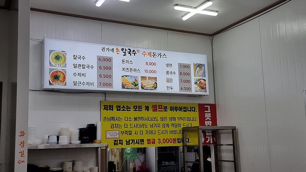 포천 영중의 성동삼거리를 조금 못 미쳐 있는 집으로 권가네 손 칼국수라는 집이다. 놀라운 것은 칼국수 한 그릇의 값이 단 돈 6,000원 이라는 것이다. 요즘의 시중 물가를 생각하면 참으로 착한 가격이다. 비슷한 가격의 칼국수집이 선단동 이마트 옆에 있다. 소흘칼국수인가 그런 집인데 여기와서 먹어보니 맛도 그집과 아주 흡사했다. 혹 비슷한 시기에 장사를 같이 한 사이일까? 아무튼 여긴 값이 저렴하다 보니 모든 서빙은 손님들이 알아서 해야 하는 셀프 서비스 가게이다. 물이며 반찬이며 심지어 음식도 손님이 가져다 먹어야 한다. 꼭 고속도로 휴게소 비슷한 방식이라 보면 된다.
