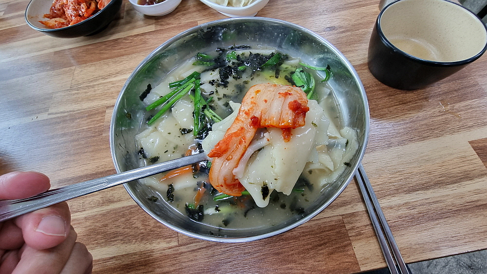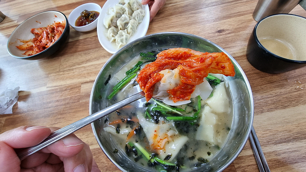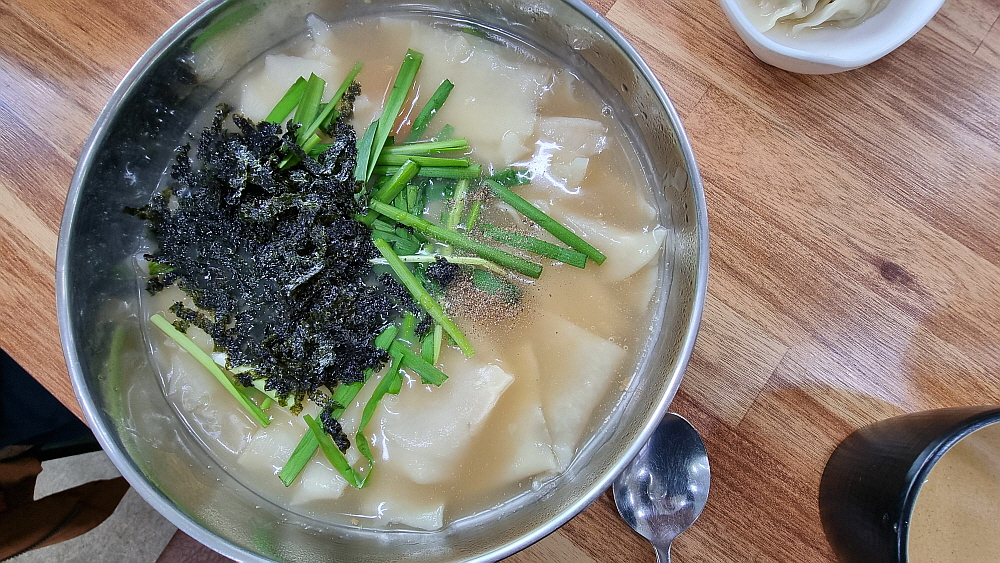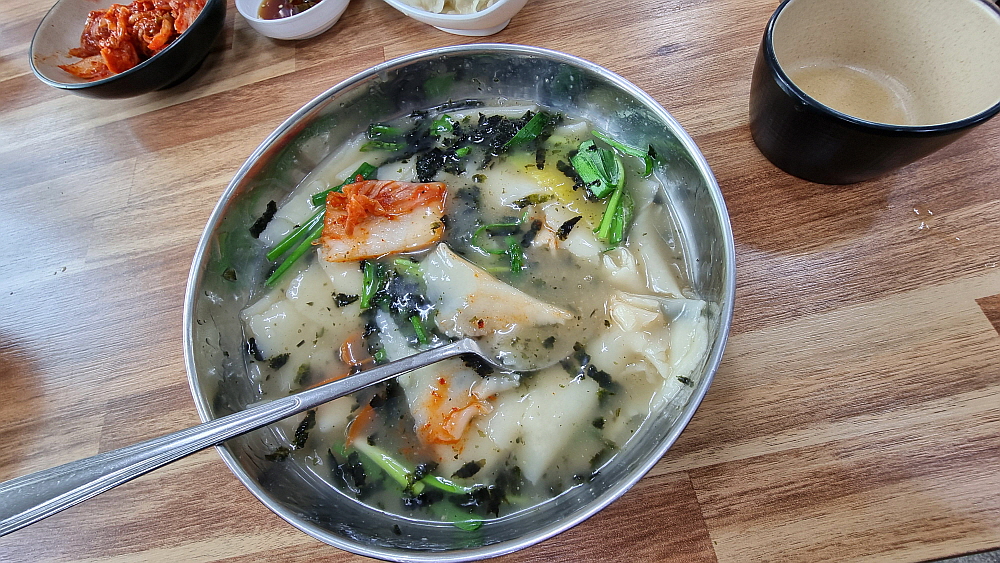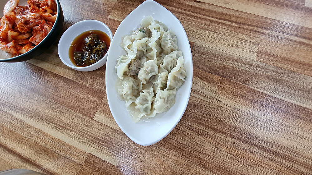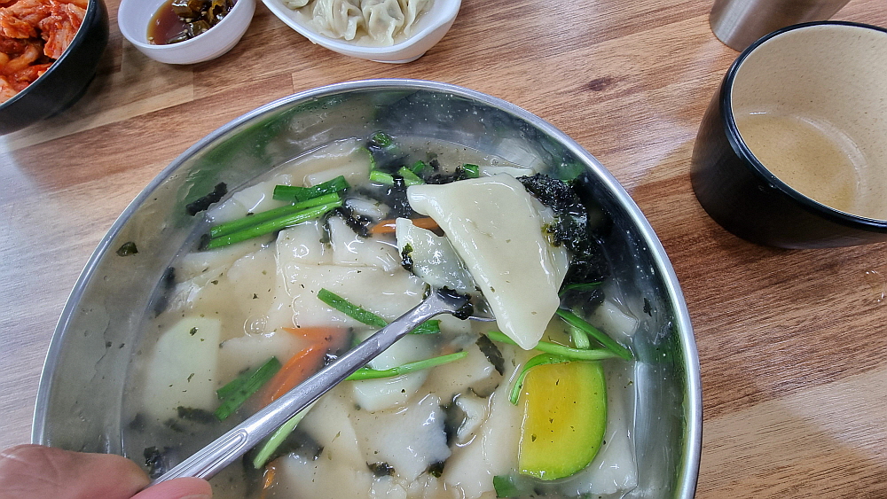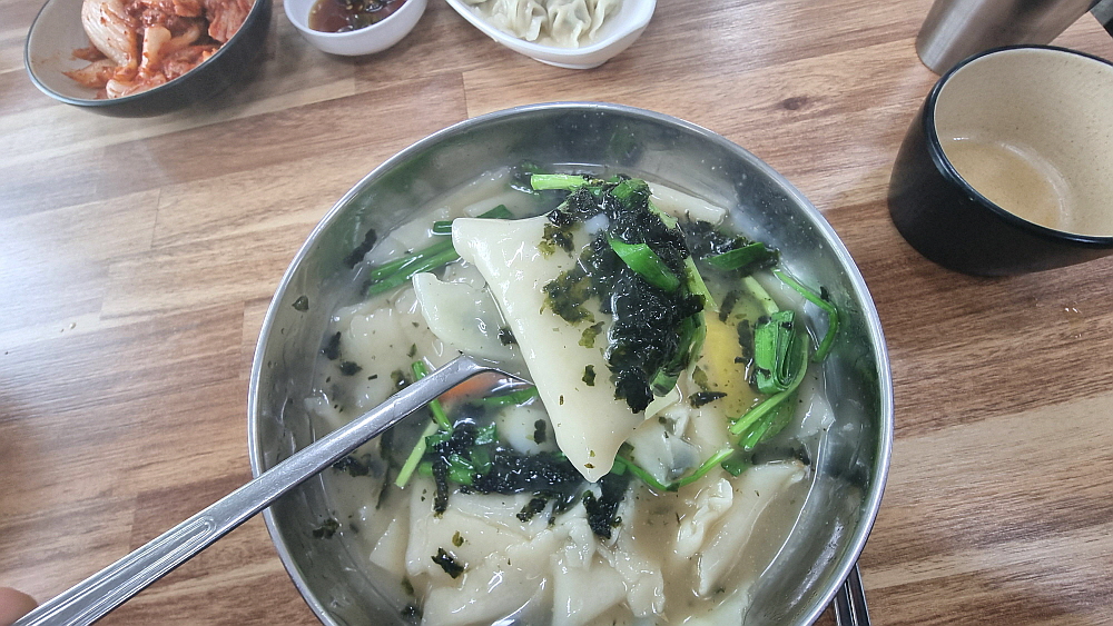 칼국수는 몰라도 수제비는 끓는 육수에 바로 밀가루 반죽을 집어 넣었는데 엄청 걸죽했다. 중국집의 울면 비슷한 식감이었다. 이런 걸죽한 죽같은 국물을 좋아하는 사람에게는 아주 일품인 메뉴다. 물론 담백하고 맑은 국물을 원하는 사람은 좀 아닐 수 있다. 수제비는 공장 반죽 같기도 하고 여기서 직접 만든 것 같기도 하고 헛갈렸다. 하지만 얇게 편 밀가루 반죽을 진한 국물과 함께 먹는 맛은 아는 사람은 누구나 인정하는 바로 그것이다. 꾸물꾸물한 날씨에 더욱 잘 맞는 영혼을 달래주는 맛이다. 칼국수나 수제비나 이렇게 비가 추적거리는 날씨엔 정말 잘 어울린다.