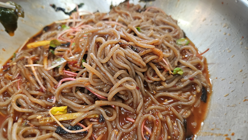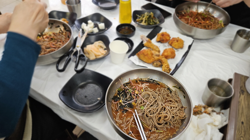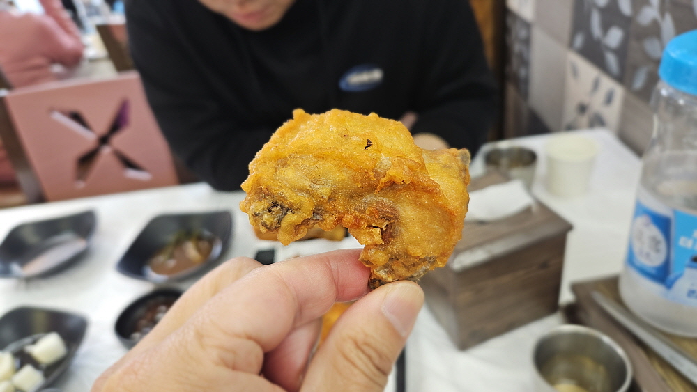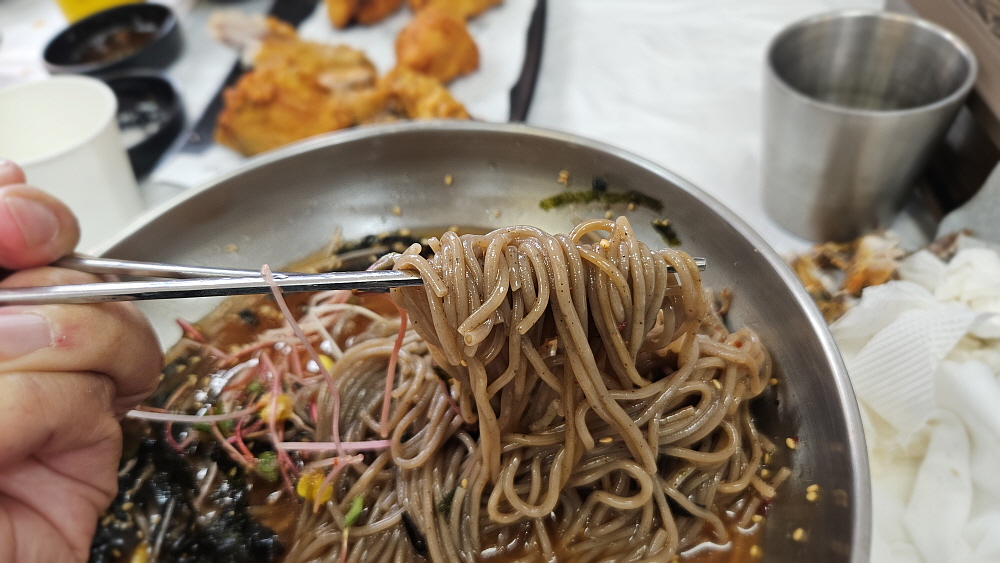 막국수보다 먼저 후라이드 치킨이 나왔다. 우리가 흔히 시장통닭이라 부르는 그런 비주얼이다. 아주 큰 닭은 아니지만 그래도 작은 닭도 아니기 때문에 반마리라 해도 먹을만 했다. 식당 안에서 진동하는 닭튀기는 냄새는 바로 이런 모양의 치킨을 만들기 위한 작업이었다. 갓 튀긴 후라이드 치킨의 맛은 따로 언급할 필요도 없는 것이다. 얼마나 고소하고, 바싹한지 참 맛이 좋았다. 닭을 좋아하지 않는 사람들도 이렇게 방금 만든 후라이드 치킨은 한 조각 먹게 될 것이다. 별 간을 하지 않은 치킨이지만 그게 또한 별미였다. 소금만 찍어 먹어도 그냥 맛이 좋았다. 역시 후라이드 치킨은 정답이다.