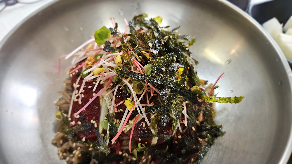 충주시 중앙탑에는 메밀막국수 집들이 많이 있다. 그런데 희안하게도 여기서는 막국수와 후라이드 치킨을 함께 판다. 이런 구성은 전국 어디에도 없는 특이한 것이다. 왜 이 일대에서는 막국수와 후라이드 치킨을 함께 먹게 된 것일까? 처음 메뉴를 보면 다들 의아하게 생각한다. 도무지 어울릴 것 같지 않은 음식들이기 때문이다. 하지만 막상 먹어보면 생각이 바뀐다. 의외로 이 조합이 아주 잘 맞는다는 것을 알게 된다. 누군가 용기를 내서 처음 시도했을 것인데 아주 그럴싸한 시도였다고 할 수 있다. 우리는 막국수와 후라이드 치킨 반 마리를 주문했다. 보통 여기는 누구나 후라이드 치킨을 주문한다.