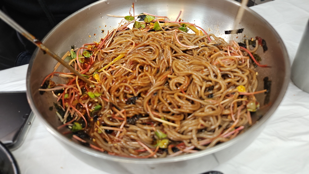 전국에서 드물게 구성된 메뉴인 후라이드 치킨과 막국수, 충주시 중앙탑면 중앙탑 뚱감자메밀막국수