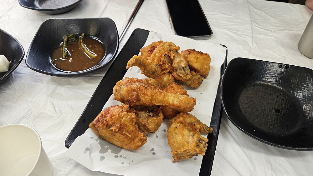 막국수는 9,000원 짜리 치고는 무순이나 새싹이 듬뿍 고명으로 올라간 푸짐한 것이었다. 메밀면 특유의 색감이 있고, 자극적이지 않은 맛이 일품이었다. 충분히 비싼 막국수와 견주어도 손색이 없을 맛이었다. 역시 이것도 전문가의 솜씨가 엿보이는 맛이다. 마치 평양냉면을 먹는 것처럼 슴슴하면서 깊은 맛이 나는 육수는 계절적으로 맞지 않을 것 같지만, 자꾸 육수를 들이키게 만들었다. 쌉쌀한 막국수 면이 후라이드 치킨을 만나면 맛이 한 단계 업그레이드가 되는 것 같다. 차가운 국수와 갓 튀겨낸 따끈한 치킨의 조합이 아주 훌륭했다. 다들 왜 막걸리를 함께 마시는지 이해가 가는 순간이었다.