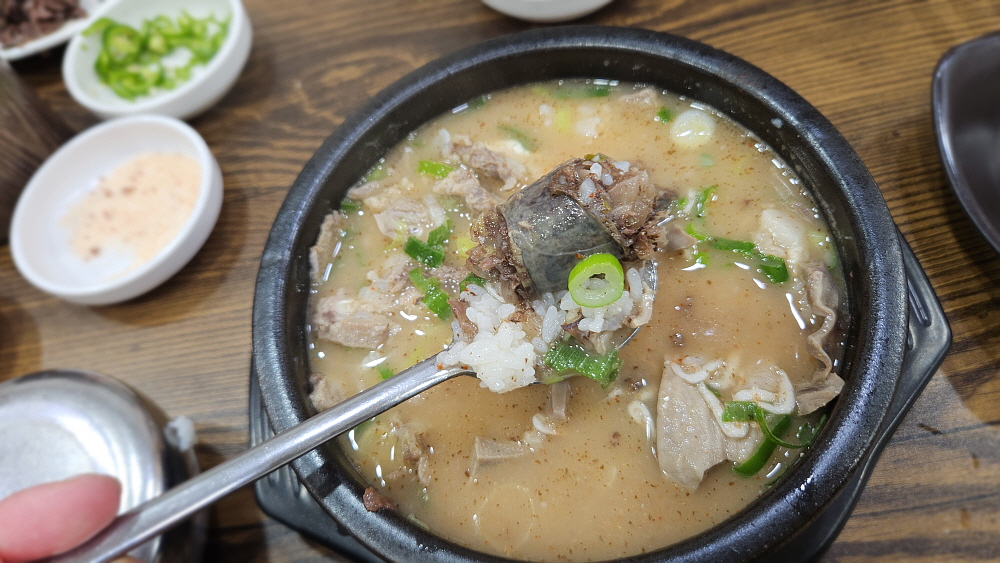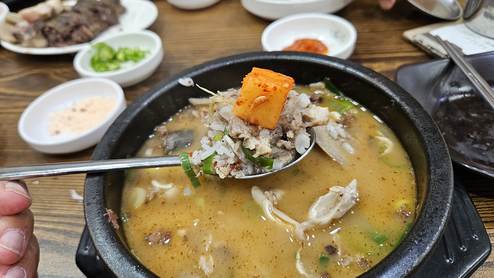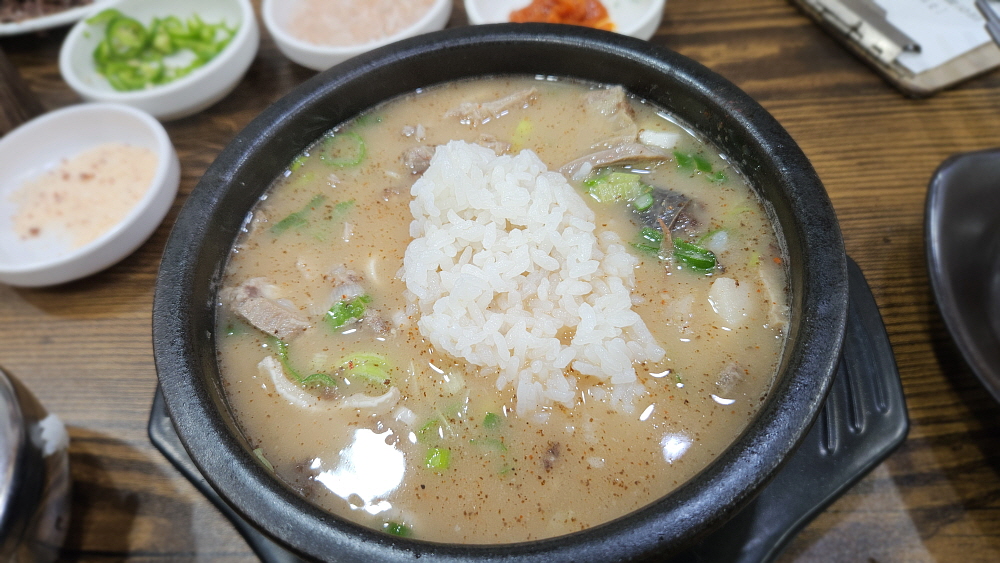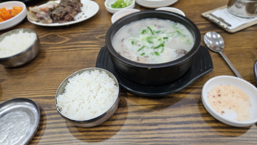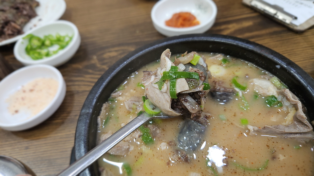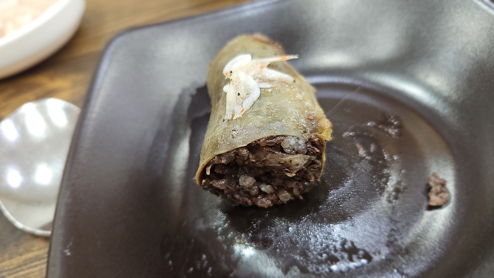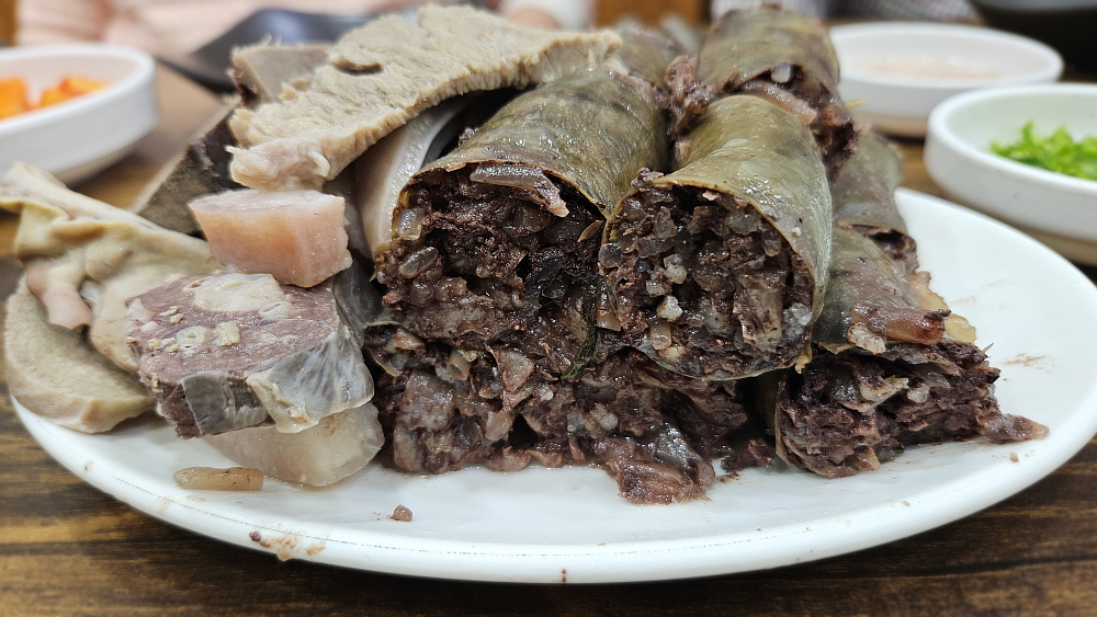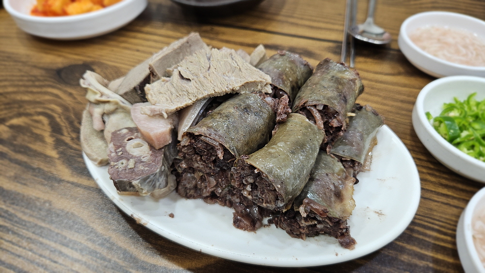 이렇게 수육으로 나온 순대를 새우젓을 찍어 먹는 것이 여기 방식이란다. 하긴 전라도의 쌈장 순대보다는 아무래도 우리와 더 친숙한 모습이라 하겠다. 국물은 무척 맑고, 담백한 편인데 우리네 무봉리 순대국처럼 손님이 이런 저런 레시피를 사용하는 방식이다. 다만 우리보다는 넣을 레시피 재료가 많지는 않았다. 포천에서는 고추씨기름에, 양념장에, 새우젓에, 들깨가루며 파, 청양고추 등 정말 여러 재료를 본인만의 방법으로 조합하여 넣는 것이 익숙하다. 그래서 처음 뽀얀 국물을 벌겋게 만들어 먹는 것이 우리네 방식이다. 여기도 비슷하긴 하지만 그렇게 다양한 재료를 주는 않았다.