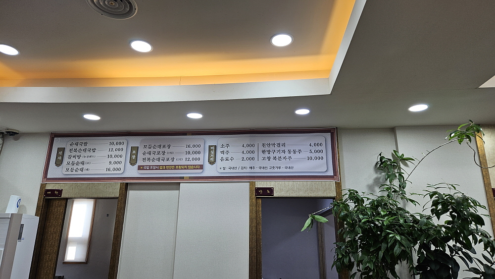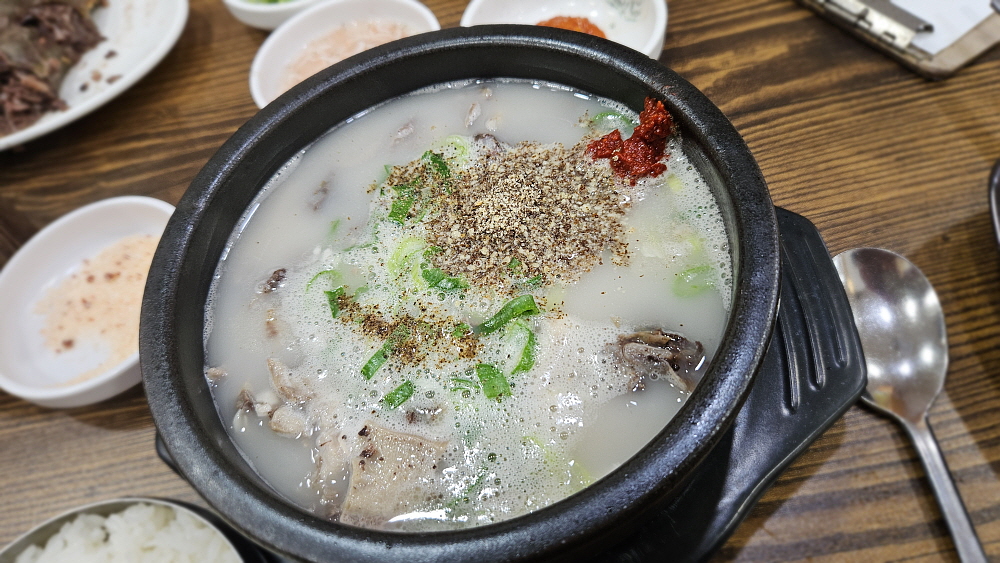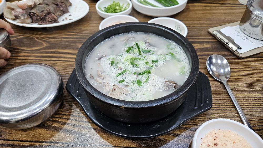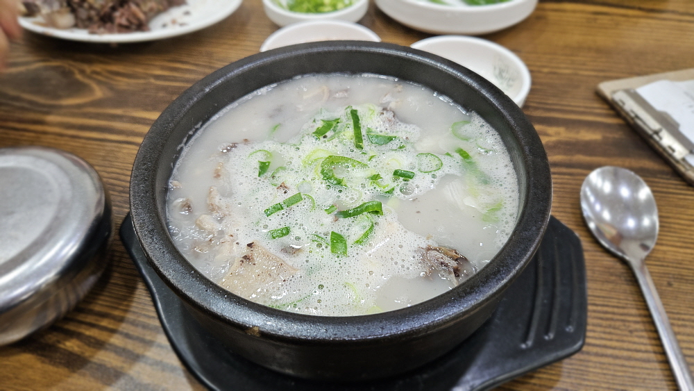 순대국밥은 10,000원으로 아주 합리적인 가격이고, 동네가 온통 순대국 집들인지라 그냥 여기가 순대의 고장이구나 하고 알 수 있을 정도였다. 식당 안에 들어가 보니 때가 아닌데도 손님들이 제법 있었다. 병천 순대국밥의 특징은 우리가 아는 일반적인 분식집의 순대인 찰 순대는 넣지 않는다는 것이란다. 그러니까 흔히 순대라고 할 수 있는 모양의 순대는 없는 셈이다. 전통 순대라 불리는 고기와 잡채가 들어간 정통의 제조법으로 만든 그 순대만으로 국을 끓여 내어주는 것이다. 거기에 돼지의 여러 내장 부위들이 들어간다. 물론 머리고기도 있다. 든든한 국밥의 전형적인 비주얼이다.