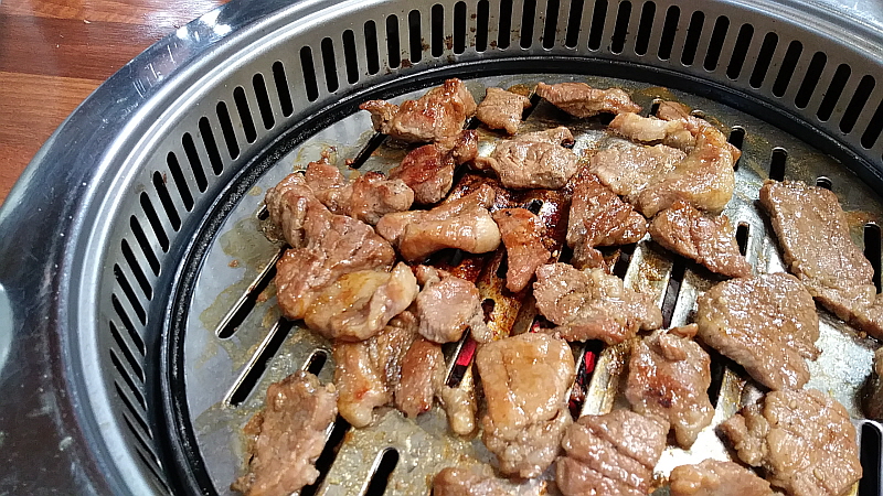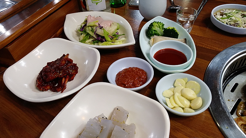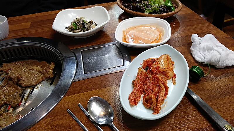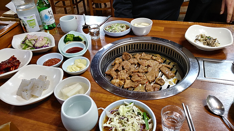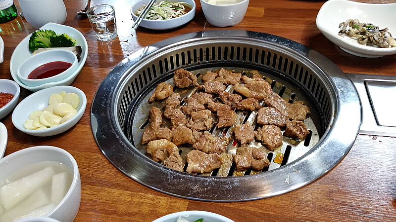 특히 갈비를 숯불에 구우면 그 향이 고기에 배어 우리가 기억하는 그 갈비의 전형적인 향과 맛이 된다. 갈비라고 나오지만 이것이 정말 돼지의 갈비 부위가 맞냐는 말들도 있었지만 야들 야들한 고기에 달콤한 양념이 만들어 내는 조화는 어쨌든 좋은 것이 사실이다. 1인분에 15,000원으로 반찬이 10여 가지 이상 나오니 좀 미안한 생각이 들 정도였고, 우리 아이들이 좋아하는 양념게장은 별미로 참 입에 착 감기는 맛이었다. 사실 돼지고기를 그닥 좋아하지 않는 나도 여기선 이런 저런 반찬으로 얼마든지 맛있는 저녁과 안주로 먹을 수 있다. 요즘 유행하는 테이블과 의자에 앉아서 방식으로 홀이 많이 바뀐 것만 빼면 가게 안의 모습도 예전과 크게 달라지지 않았다.