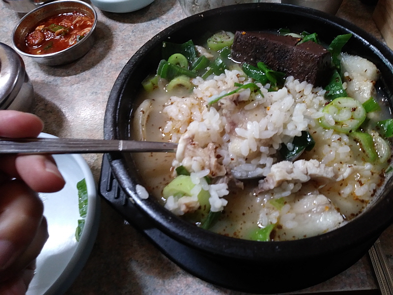 친구의 7살 어린 딸도 이 국밥을 좋아한다니 참 신기한 일이었다. 그만큼 국물이 부드럽고 자극적이지 않으면서 깊은 맛이 났다. 특이한 것은 이곳은 순대국은 선지가 들어 있다는 것이었다. 보통 순대국에 선지를 넣는 경우는 많지 않은데 구수한 맛이 일품인 신선한 선지가 듬뿍 들어 있었다.