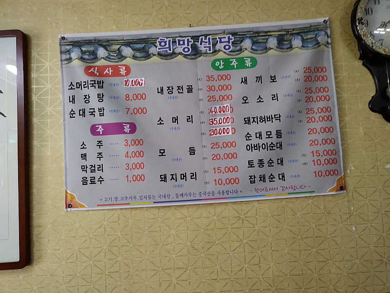 오래된 시장에 전통깊은 식당이 있다는 것은 어찌보면 당연한 일이다. 희망식당도 그런 포스가 느껴지는 곳이었다. 주로 순대국이나 소머리국밥 같은 우리네 전통적인 국밥을 팔고 있는 곳으로 많은 시장상인들과 손님들의 허기진 속을 달래주던 곳이리라... 간밤에 또 그렇게 무리해서 달린 우리들에게 아침상으로 받아든 순대국과 소머리국밥은 그대로 보약과 같은 것이다. 뽀얀 돼지뼈 국물이 먹음직스런 순대국은 한국 사람이라면 누구나 좋아하는 해장 국밥의 모습이었다. 탁자도 실내홀도 세월의 무게를 담고 있는 이곳은 왠지 영화나 드라마의 한 장면에서 본 것 같은 친근하면서도 익숙한 분위기를 자아낸다.