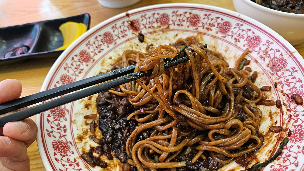 노르스름한 면발이 먹을직스럽고, 적지 않은 적당한 양이라 보기만 해도 흐뭇했다. 이런 점심이야 말로 한국 사람들이 그렇게나 좋아하는 평범한 서민들의 아이템일 것이다. 하루에 점심으로 짜장면을 먹는 사람이 대략 전국적으로 100만 명 정도 된다니 대단한 양이다. 우리처럼 이렇게 짜장면을 받고 비비기 전의 흥분을 가진 사람이 전국에 그렇게나 많다고 생각하면 커다란 대가족의 식사나 마찬가지가 아닐까 하는 생각이 들었다. 우리가 대한민국이란 커다란 가정의 식구들이 맞지 않을까... 간짜장의 생명은 갖 볶은 것 같은 느낌의 짜장양념이다. 이집은 유니짜장처럼 잘게 자른 재료가 특징이다.