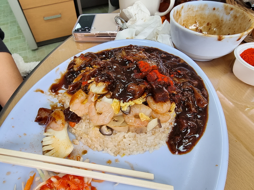 야무지게 고추가루도 뿌리고 슥슥 잘 비벼 놓고 드디어 제일 맛나다는 첫 입을 먹어 보았다. 너무 달지 않으면서 풍부한 맛이 입안을 채워주는 우리가 흔히 말하는 옛날 짜장의 맛이었다. "맛있다!"는 감탄이 절로 나왔다. 요즘은 짜장면도 시대흐름인지 너무 달게 만드는 집이 많은데 여긴 아니었다. 과연 전통을 간직한 집이라는 말처럼 너무 과하게 달지 않으면서 춘장과 재료의 향이 살아 있는 우리가 늘 생각했던 바로 짜장면의 맛이었다. 이런 중국집을 알게 된 것이 기쁜이라는 생각마저 들었다. 재료도 풍부했다. 짜장의 소스에 고기와 야채가 풍부하게 들어 있었다.