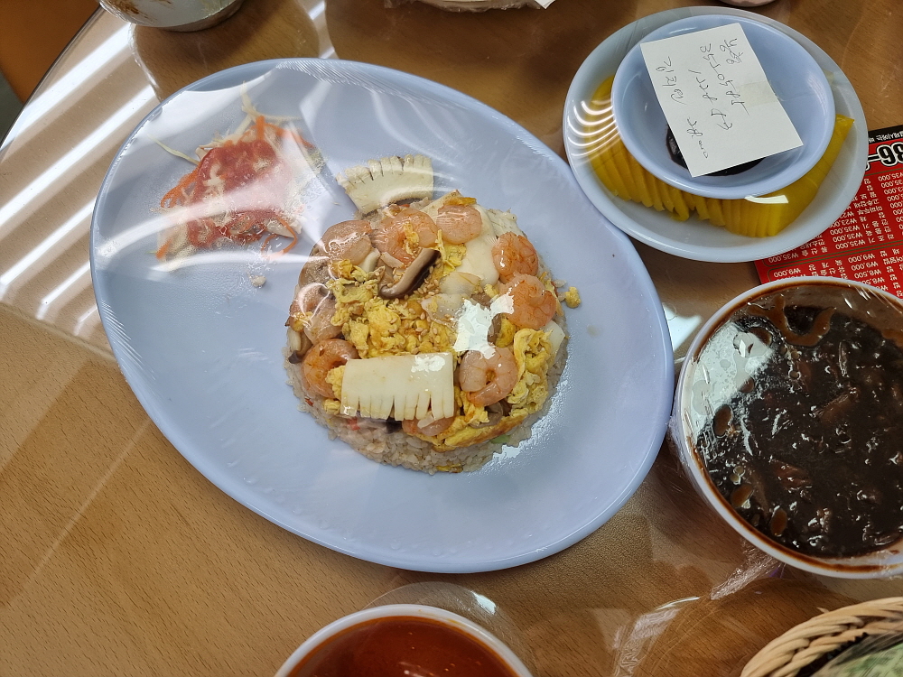 우리는 간짜장과 새우 볶음밥을 주문했다. 누군가 짬뽕을 먹어 주었으면 했는데 그것은 다음 기회에 만나보기로 했다. 음식값이 28,000원 이란다. 저렴한 편이다. 그런데 보니까 간짜장은 8,000원 밖에 안 하는데 새우볶음밥이 의외로 12,000원 이라는 가격이었다. 볶음밥이 조금 더 비싸긴 하지만 새우가 들어가서 그런가? 아무튼 우린 누구나 그렇듯 포장을 뜯기 전에 다가오는 약간의 흥분된 기분으로 쌓여 있는 랩을 제거하고 드디어 전통을 가진 중국집이라는 황해루의 짜장면을 먹게 되었다.