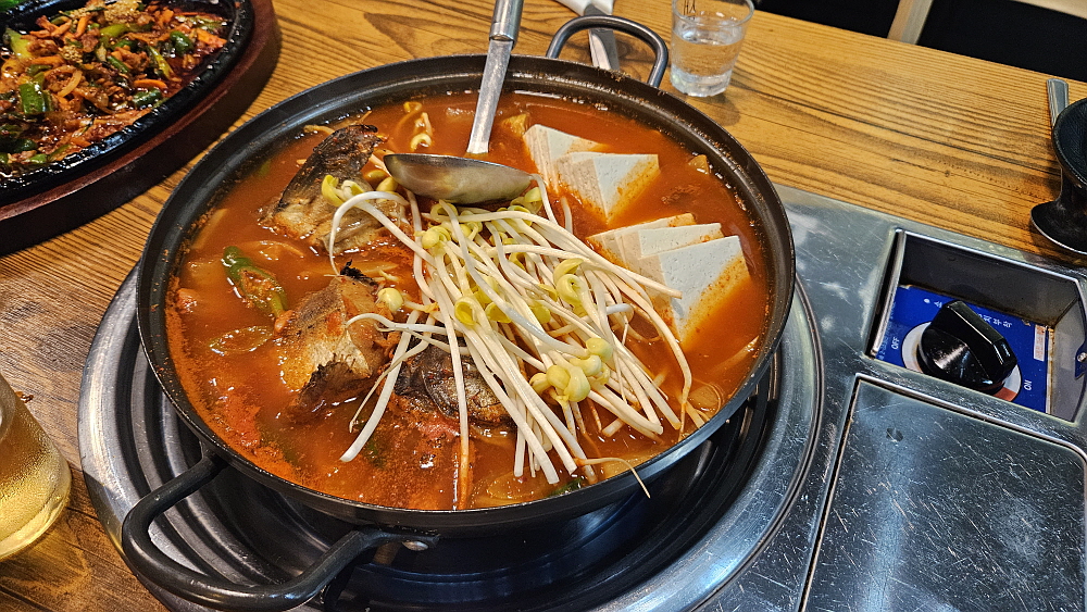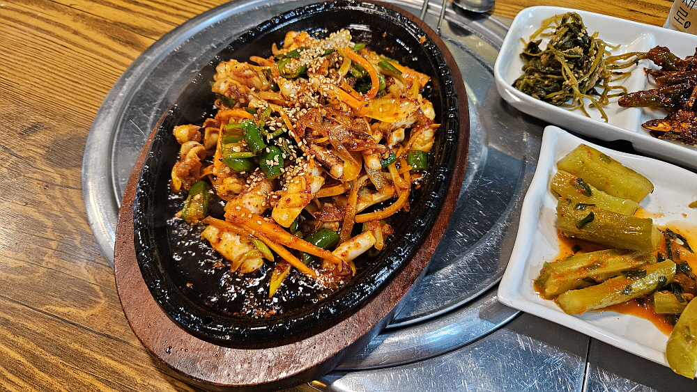 안주가 아주 많은 것은 아니지만 그래도 어느 정도는 갖추고 있다. 특히 눈에 띄는 것은 계란 후라이 한 개 1,000원이었다. 아재들은 소주를 마시다 보면 어느 순간 계란 후라이를 먹고 싶어지기 때문이다. 집에서 먹는다면 계란을 꼭 후라이로 해서 먹곤한다. 그런 아재감성을 잘 감안한 메뉴인거 같다. 우리는 날도 덥고 하여 매콤한 오징어 볶음을 주문했다. 동태찌개도 먹고 싶었는데 일단 불 피우고 앉아 끓이는 것이 부담스러워 먹다가 부족하면 더 주문하기로 했다. 밑반찬이 몇 개 나오는데 열무김치를 먹어보니 이집 주인장이 정말 실력이 있는 주방장인 거 같았다. 반찬들의 간이 딱 맞고, 감칠맛이 좋았다. 이런 반찬들 만으로도 소주를 얼마든지 먹을 수 있을 것 같다.