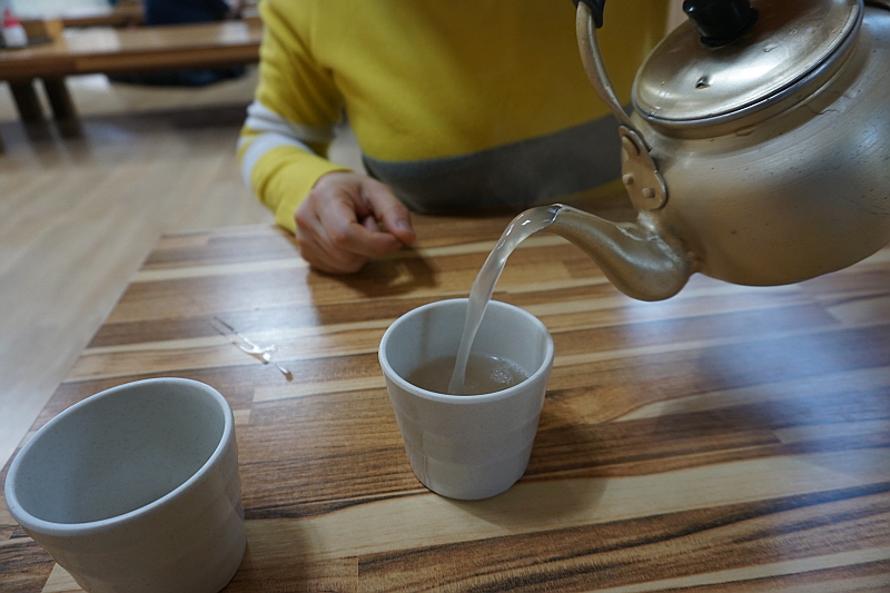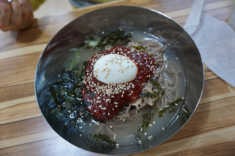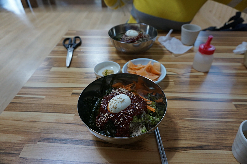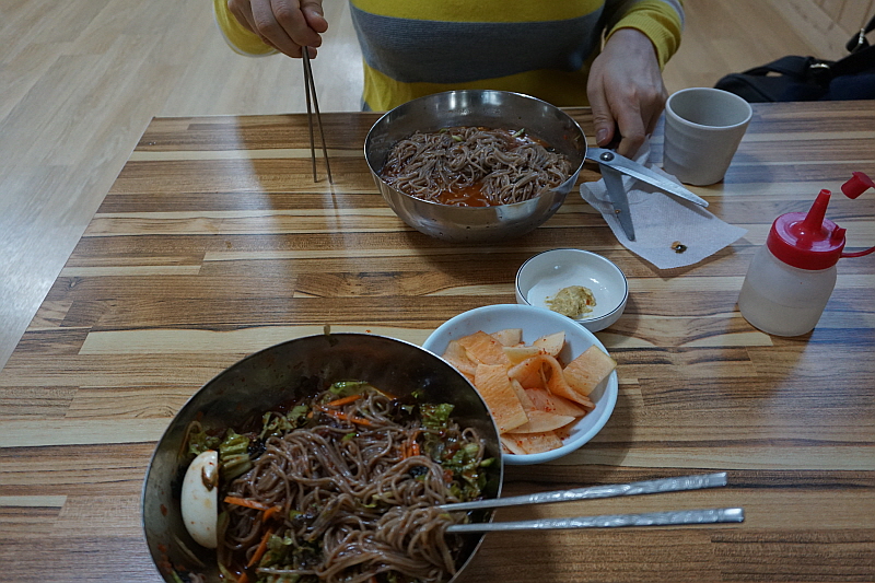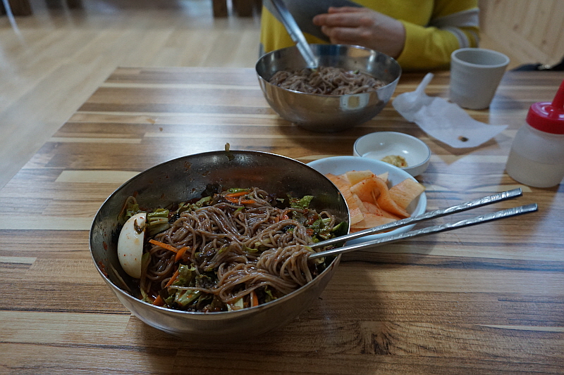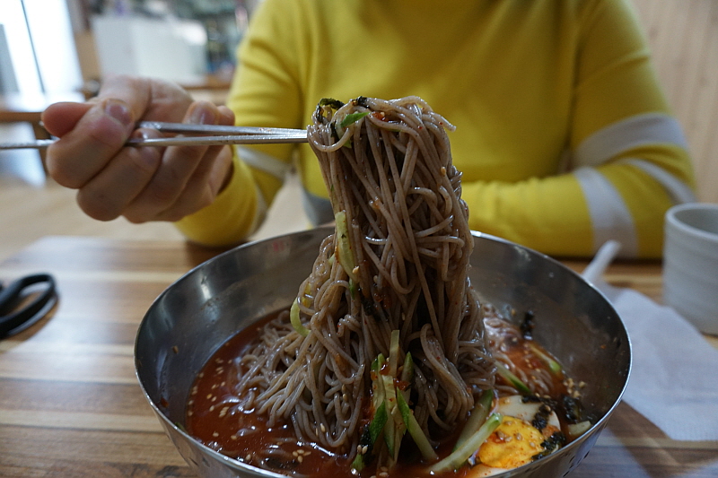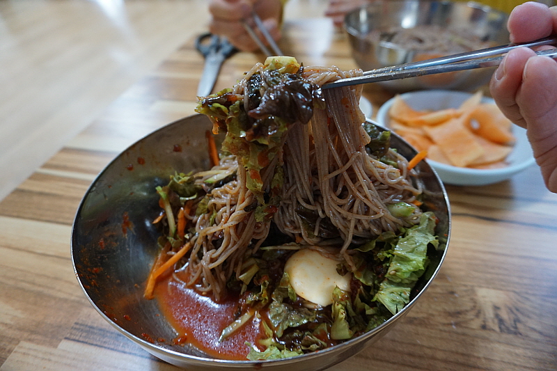 우리는 둘 다 먹어보자는 의미에서 그냥 막국수와 비빔막국수를 주문했다. 평소엔 분명 내가 물 막국수를 먹어야 한다. 하지만 이날 만큼은 왜인지 비빔이 더 끌렸다. 마눌도 그랬다. 왠일로 비빔을 먹냐고... 그런데 먹어 보니 여긴 물 보단 비빔이 정답인 것 같았다. 100% 메밀로 만든 면은 아니지만 분명 메밀의 향이 진하게 나는 면에 알싸하고 자극적이지 않은 비빔 양념이 그만이었다. 다른 집엔 별로 없는 진한 면수를 주는 것도 그렇고 여긴 정말 메밀 막국수의 내공있는 맛집이 맞았다. 비빔막국수를 먹으면서 얼마나 면수를 들이켰는지 그 주전자가 다 동이 났다.
