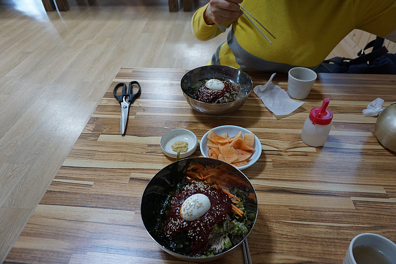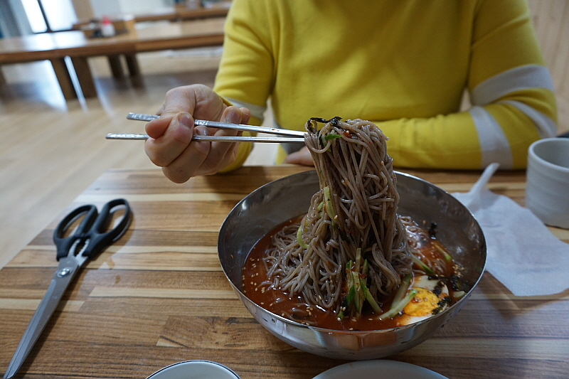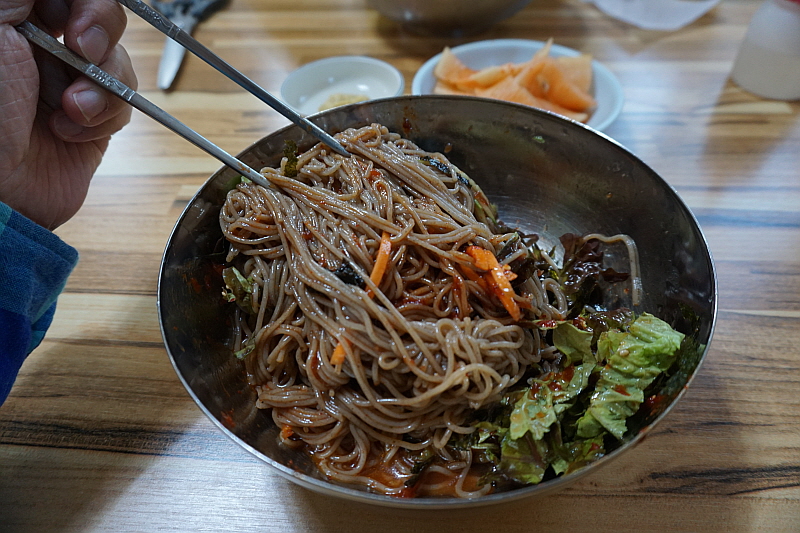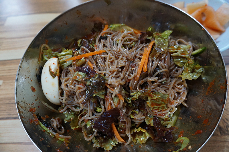 우리는 둘 다 먹어보자는 의미에서 그냥 막국수와 비빔막국수를 주문했다. 평소엔 분명 내가 물 막국수를 먹어야 한다. 하지만 이날 만큼은 왜인지 비빔이 더 끌렸다. 마눌도 그랬다. 왠일로 비빔을 먹냐고... 그런데 먹어 보니 여긴 물 보단 비빔이 정답인 것 같았다. 100% 메밀로 만든 면은 아니지만 분명 메밀의 향이 진하게 나는 면에 알싸하고 자극적이지 않은 비빔 양념이 그만이었다. 다른 집엔 별로 없는 진한 면수를 주는 것도 그렇고 여긴 정말 메밀 막국수의 내공있는 맛집이 맞았다. 비빔막국수를 먹으면서 얼마나 면수를 들이켰는지 그 주전자가 다 동이 났다.