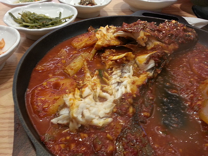 제주 동문 시장 근처에 있는 이 집은 전통이 오래 되었다는데 새로 건물을 지었는지 깔끔하고 깨끗한 홀분위기였다. 돌우럭 점심특선이 1인에 13,000원이라는 큰 문구를 보고 들어 갔는데 나중에 계산 할 때 보니 28,000원을 받는 것이다. 밖에 나가 자세히 보니 아주 작은 글씨로 3인 부터가 1인에 13,000원이란다. 그냥 두 명만 가면 14,000원이라는 것이다. 이건 좀 아니다 싶었다. 약간은 그 점에 맘이 상하긴 했다. 하지만 가장 제주도스러운 이 음식을 먹어 봤다는 경험치는 좋았다. 정말인지는 몰라도 가게 안에 돌우럭을 광고하는 글에 제주도 사람들 중에도 이 음식은 1%만 먹어 봤다고 하니 우린 아주 드문 음식을 먹은 셈이다.