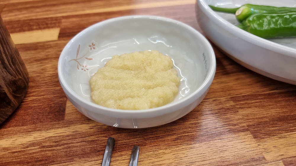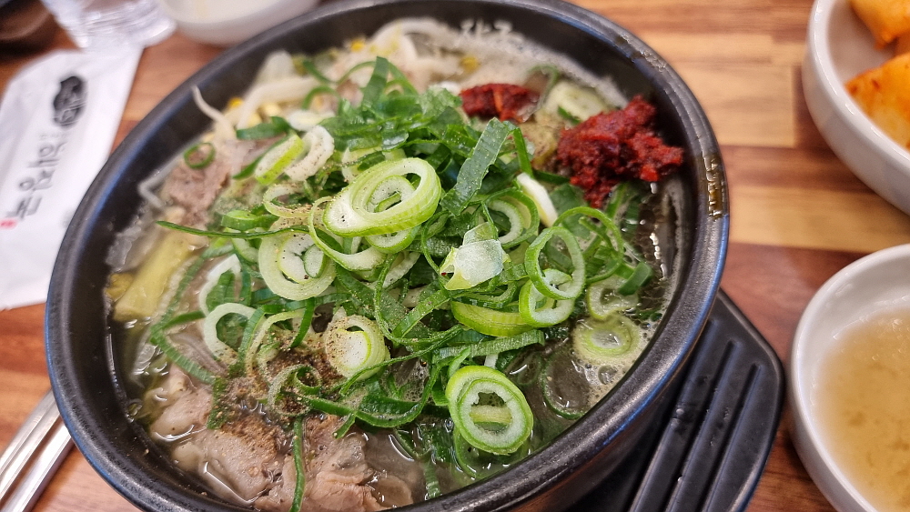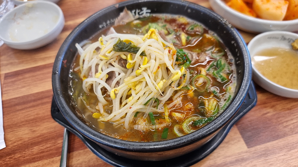 해장국 한 그릇의 가격은 12,000원이다. 결코 싼 가격은 아니다. 소고기 해장국이라고는 하지만 말 그대로 서민들이 음식인 해장국이 12,000원이라는 것은 부담스러울 수 있는 값이다. 그래도 여전히 손님들은 많았다. 이런 계절엔 역시 해장국 만한 것이 없을 것이다. 진한 국물에 밥을 말아 먹으면 오후 내내 속이 든든하고 몸도 뜨끈해지는 법이다. 이집은 손님 테이블에 갈은 마늘을 준다. 이것을 해장국에 넣어 먹으라는 뜻 같다. 그리고 소고기를 찍어 먹을 간장도 있다. 재주에는 원래 돼지로 만든 국밥이 유명한데 특이하게 제주은희네는 소고기 국밥이다. 이런 것도 특색이라 할 수 있을까?