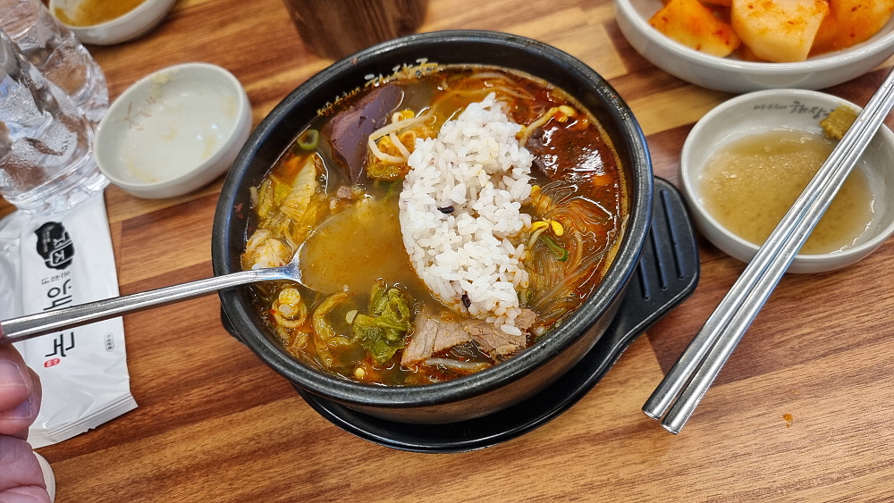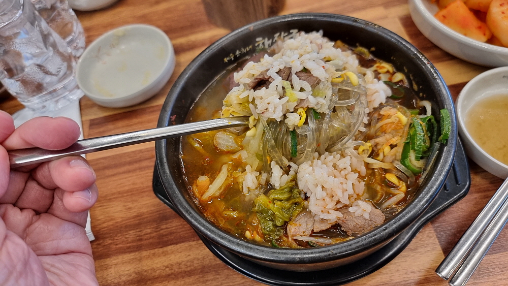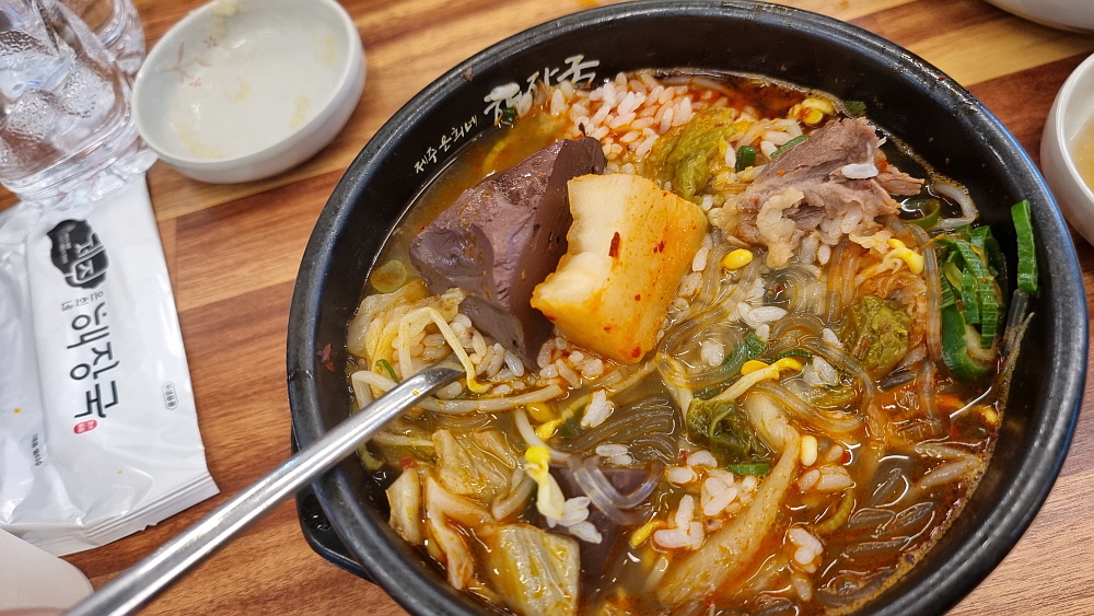 하지만 뚝배기 속을 헤집다 보면 엄청난 양의 콩나물을 만나게 된다. 그래서 소고기 뭇국이 아니라 해장국이 되는 것이다. 그리고 당면과 선지가 들어 있다. 선지가 들어갔기 때문에 다른 이견이 있을 수 없다. 이것은 그냥 해장국이다. 진한 국물과 선지의 조화는 서울 창신동의 해장국을 연상케했다. 예전에 창신동의 해장국집 참 많이 들락거렸다. 토렴을 해주는 국밥이라 아주 뜨겁지 않으면서 과하게 맵지 않고 부드러운 듯 진한 국물이 창신동의 특징이었는데 제주 은희네는 좀 더 맵고, 간간한 맛이 자극적이라 하겠다. 국밥은 역시 밥을 말아야 완성이 된다.