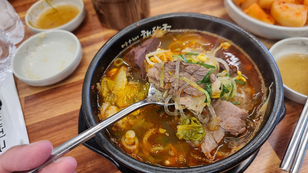 제주 은희네 해장국은 소고기 건더기가 푸짐하게 들어가고 송송 썬 대파가 엄청 올라가는 국밥이다. 거기에 손님 취향에 맞게 양념장도 넣고 후추도 뿌리고 간을 맞춘다. 소금은 넣을 필요가 없었다. 충분히 간간했다. 파가 많이 들어간 비주얼은 무척 맘에 들었다. 개인적인 취향이지만 국밥엔 무조건 대파가 많이 들어가야 한다. "그게 국밥이냐 파국이지?" 라고 비아냥거리는 친구들도 있지만 어쨌든 국밥은 파맛이 상당한 부분을 차지한다. 국물은 시원하면서 진한 소고기 국물이었다. 해장국이라기 보다는 소고기 뭇국 같다는 느낌도 들었다. 묵직한 국물은 그대로 밥을 불렀다.
