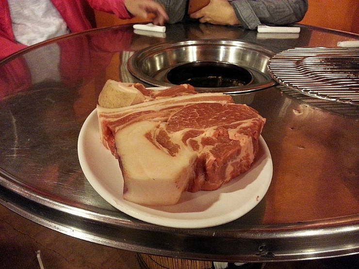 인터넷에서는 이집에 대하여 호불호가 갈리고 있었다. 맛있다는 사람과 불친절하고 비싸다는 폄하하는 내용이 참 신기하게도 비슷한 비율로 올라와 있었다. 어쨌든 우린 이 집으로 왔고, 생각했던 것보다는 사람이 많지 않아 한산했다. 전화로는 예약도 받지 않는다고 했는데 이 정도로 한산하다면 굳이 예약에 대한 걱정을 하지 않아도 될 듯 했다. 다른 것은 몰라도 이집의 돼지고기 두께만은 정말 처음 보는 엄청난 것이었다. 이 정도의 양이 1kg이다. 그러니까 한 근 반이 넘는 양이긴 하다. 그런데 맛있어 보이기는 하지만 이 양이 100,000원이다. 그것은 한우와도 거의 같은 가격의 돼지고기라는 말이다.