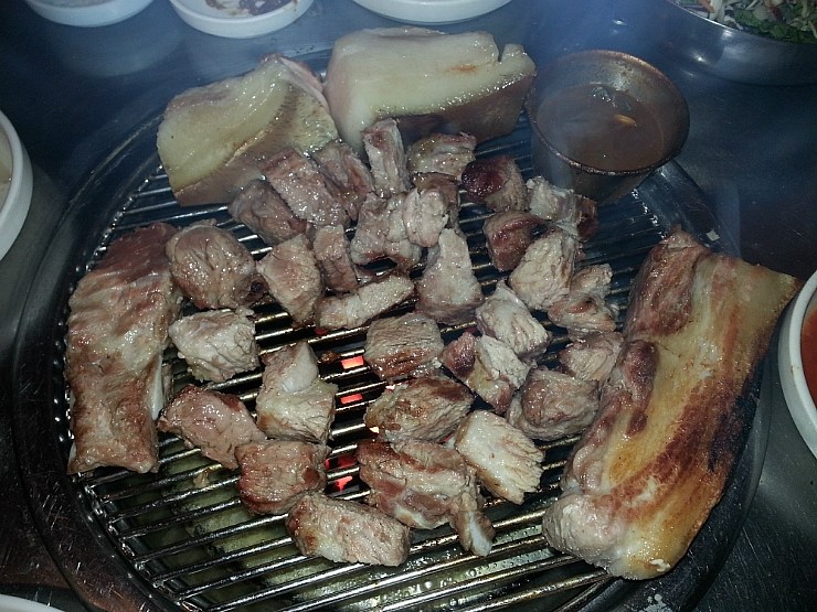 다 익는데 까지는 30분 정도 걸린 것 같다. 익은 고기를 상추쌈에 싸서 먹는 고전적 방법이나 이집만의 특별한 비법으로 만든다는 갈치액젓 같은 저 소스에 찍어 먹는 방법이나 기타 등등 알아서 맛나게 먹으면 된다. 육즙이 그대로 남아 있어 돼지고기를 좋아하는 사람이라면 나름 만족해 할 만한 상태의 고기였다. 술 안주로 저녁식사로 손색없는 맛이지만 값은 거의 호텔에서 먹는 스테이크와 맞먹는 것으로 정말 다시 가고 싶은 생각이 안 들 정도로 비쌌다.